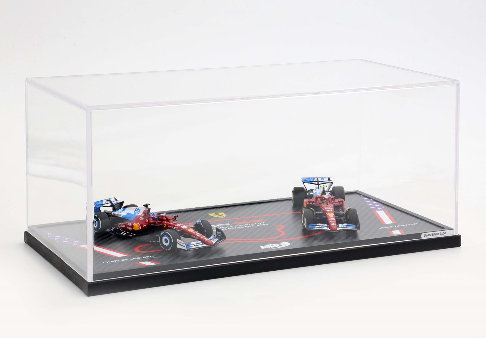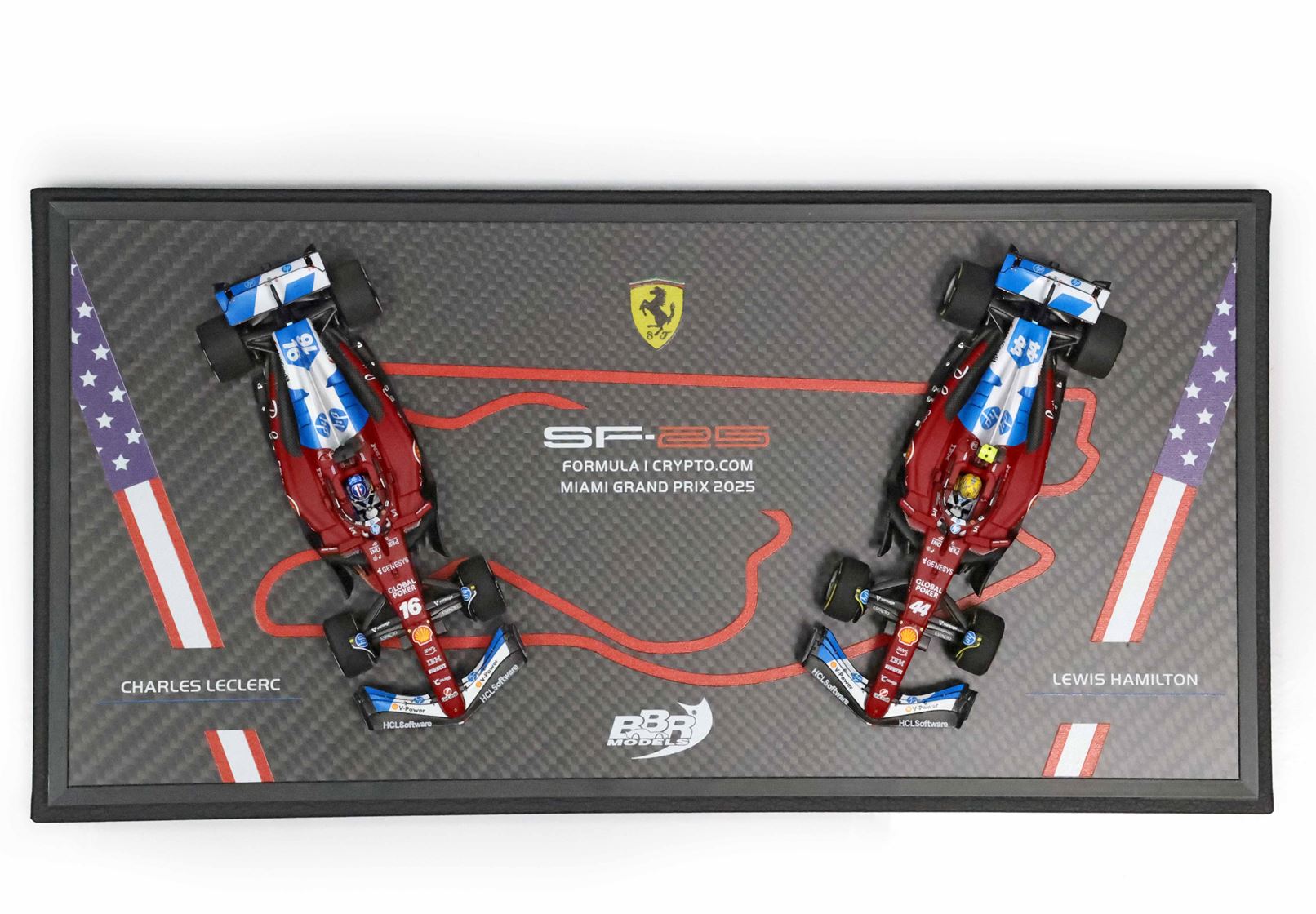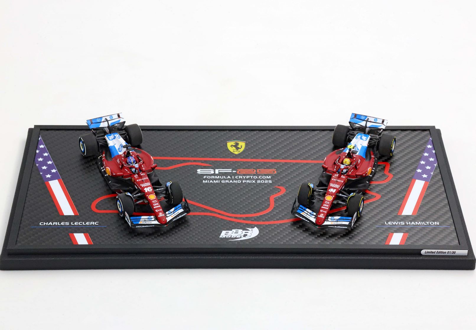 Sulla base di questo modello speciale è stata stampato il circuito di Miami. Sulle due auto in scala 1/43 di Leclerc e Hamilton si nota la livrea speciale dedicata da Ferrari al GP statunitense.