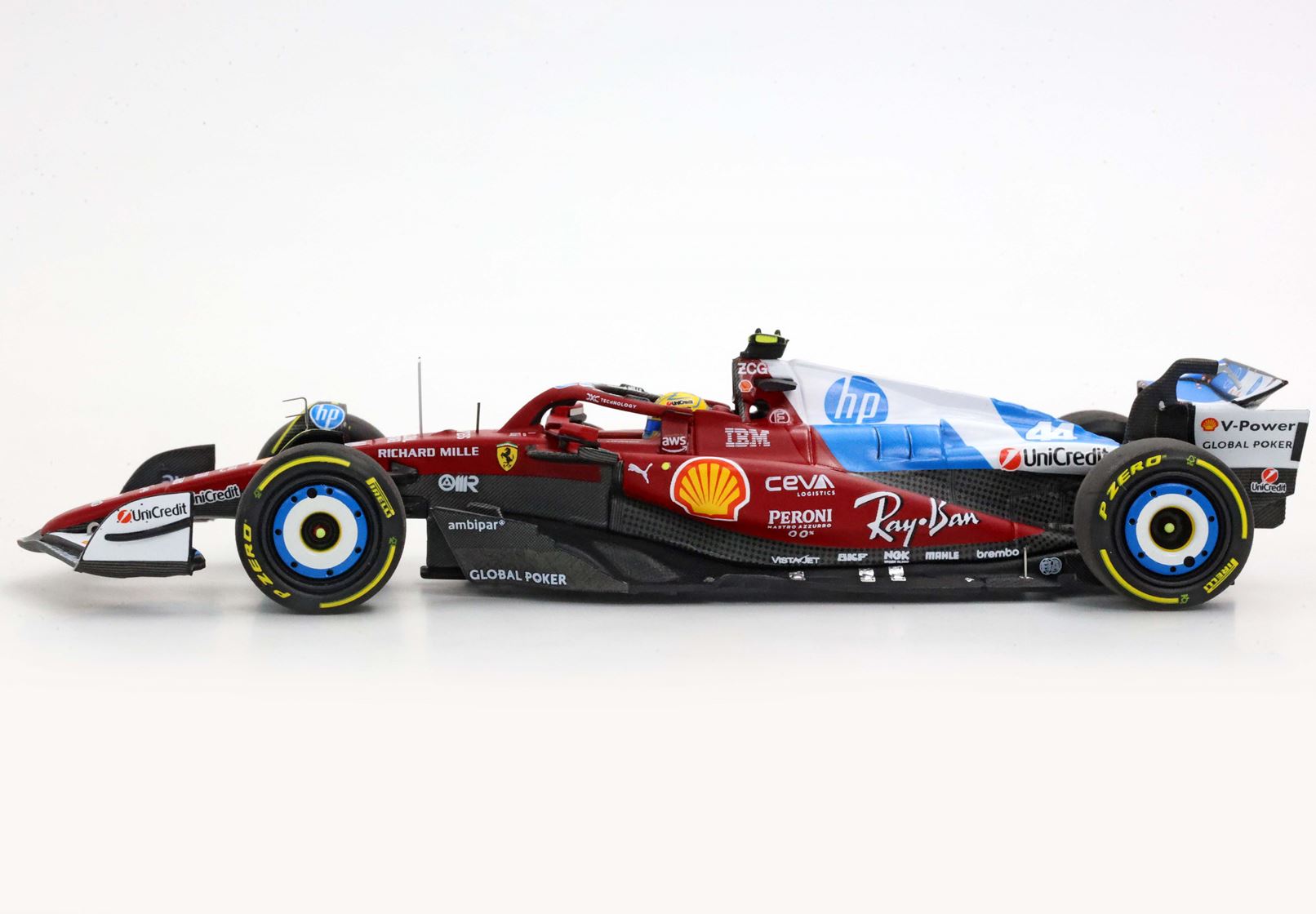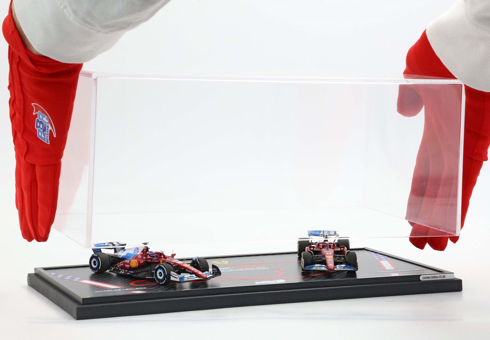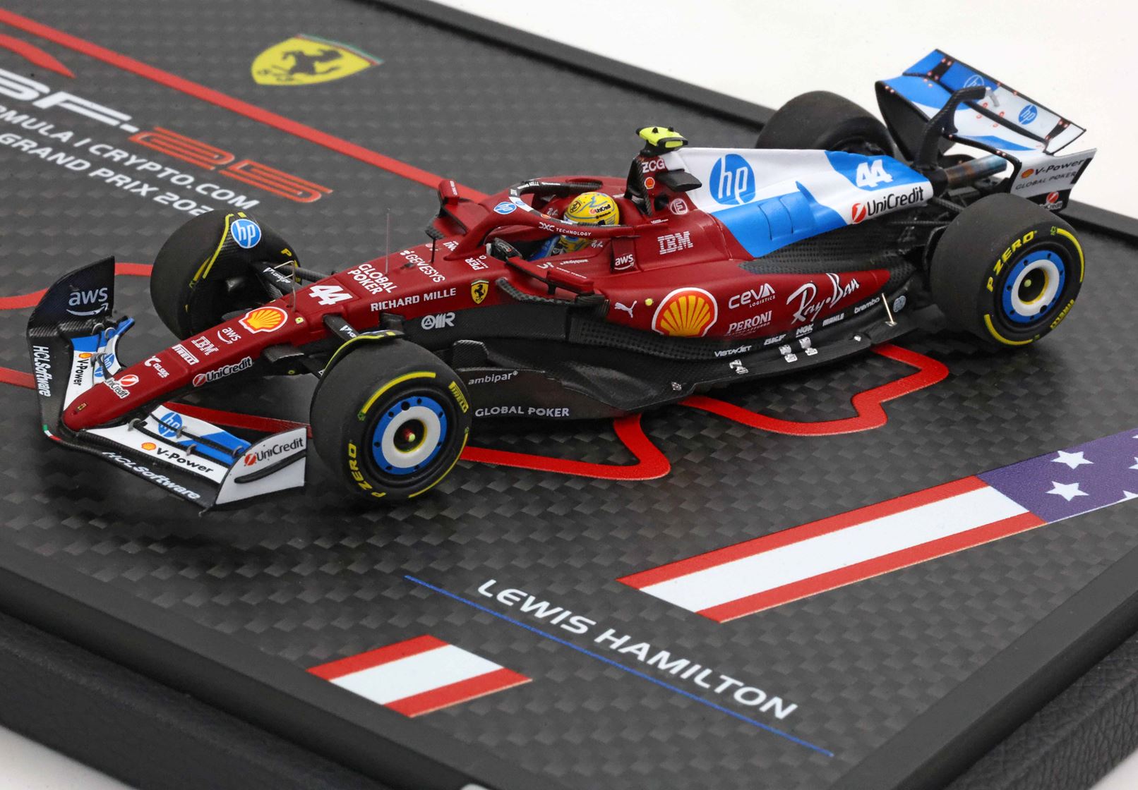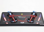 Sulla base di questo modello speciale è stata stampato il circuito di Miami. Sulle due auto in scala 1/43 di Leclerc e Hamilton si nota la livrea speciale dedicata da Ferrari al GP statunitense.