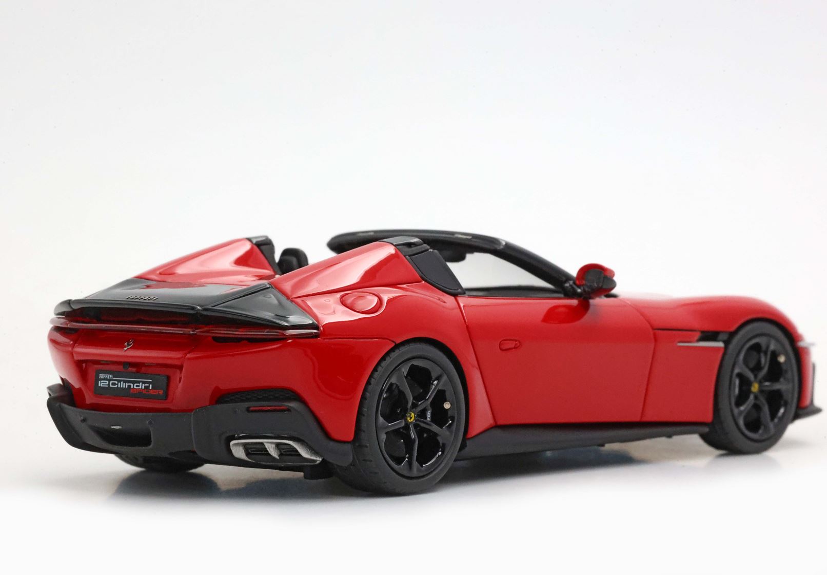 Le forme marcate delle due "pinne" posteriori costituiscono il carattere principale della Ferrari 12Cilindri Spider. Le linee essenziali sono rese muscolari dai parafanghi. Quello posteriore prominente ma senza eccessi, è perfettamente integrato nella geometria dell'auto. Quello anteriore, con evidente richiamo alla 365GTB Daytona, mostra il suo fascino sinuoso impreziosendo la fiancata. Nel frontale, un'unica fascia avvolgente integra i fari e i DRL come due lame di luce. Proporzioni perfette per una GT: muso lunghissimo, abitacolo compatto e retro corto.
