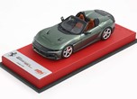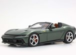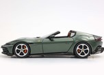 Le forme marcate delle due "pinne" posteriori costituiscono il carattere principale della Ferrari 12Cilindri Spider. Le linee essenziali sono rese muscolari dai parafanghi. Quello posteriore prominente ma senza eccessi, è perfettamente integrato nella geometria dell'auto. Quello anteriore, con evidente richiamo alla 365GTB Daytona, mostra il suo fascino sinuoso impreziosendo la fiancata. Nel frontale, un'unica fascia avvolgente integra i fari e i DRL come due lame di luce. Proporzioni perfette per una GT: muso lunghissimo, abitacolo compatto e retro corto.