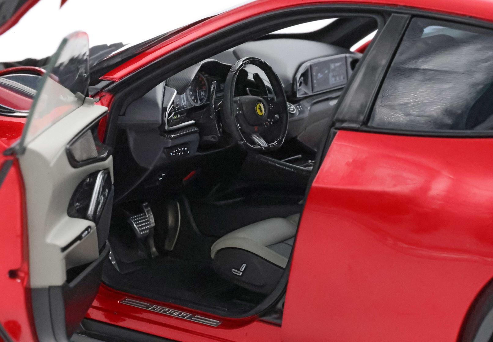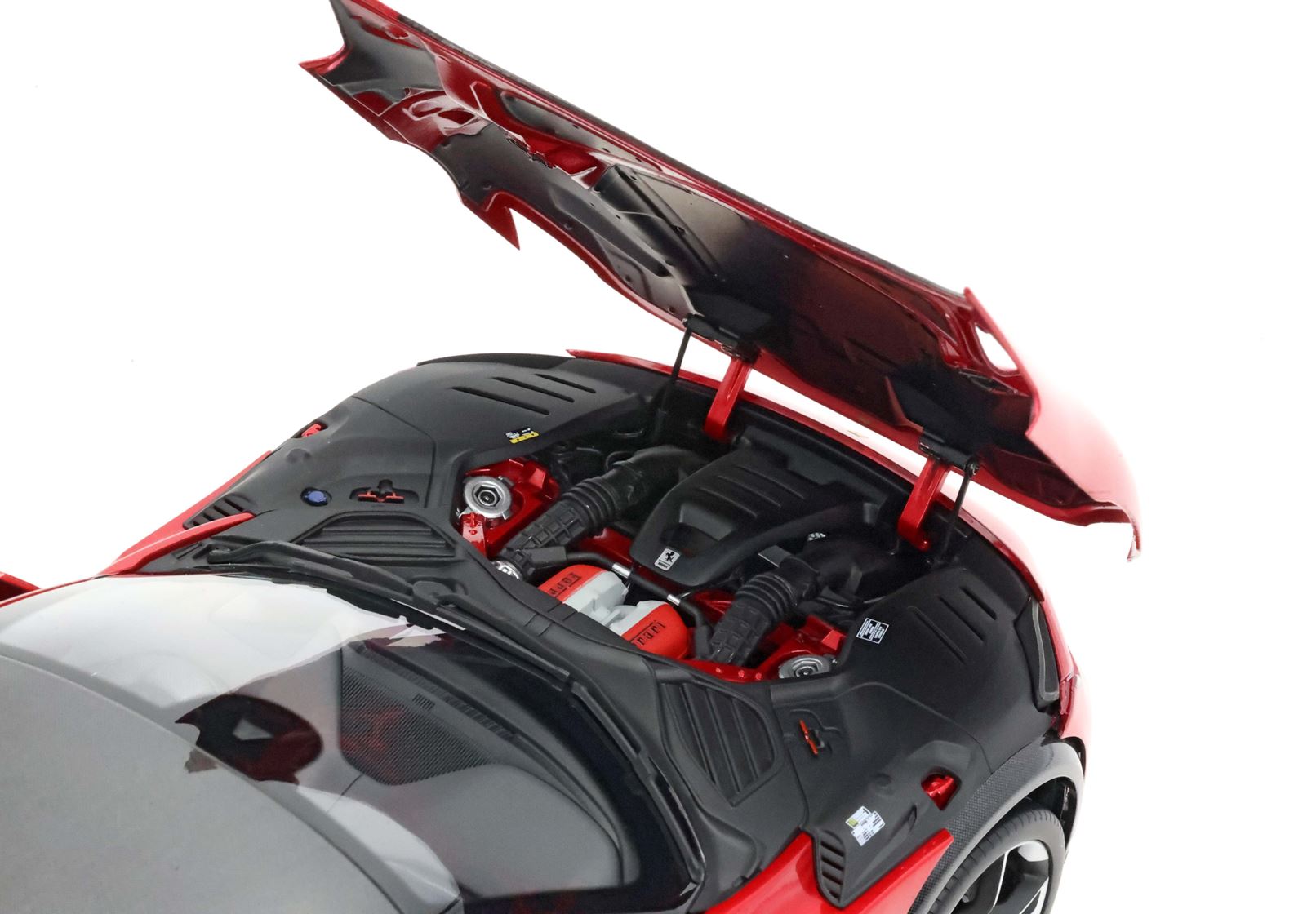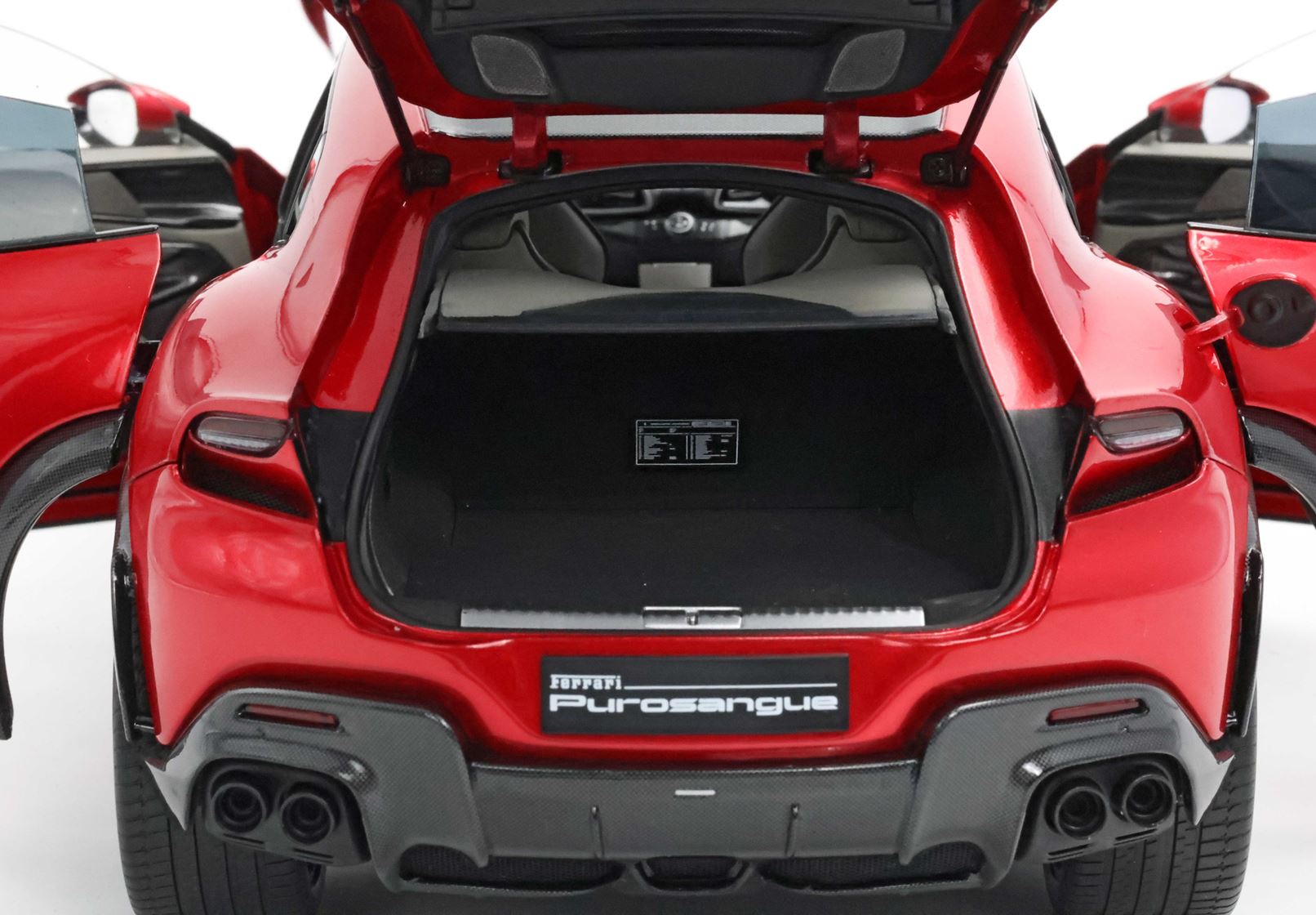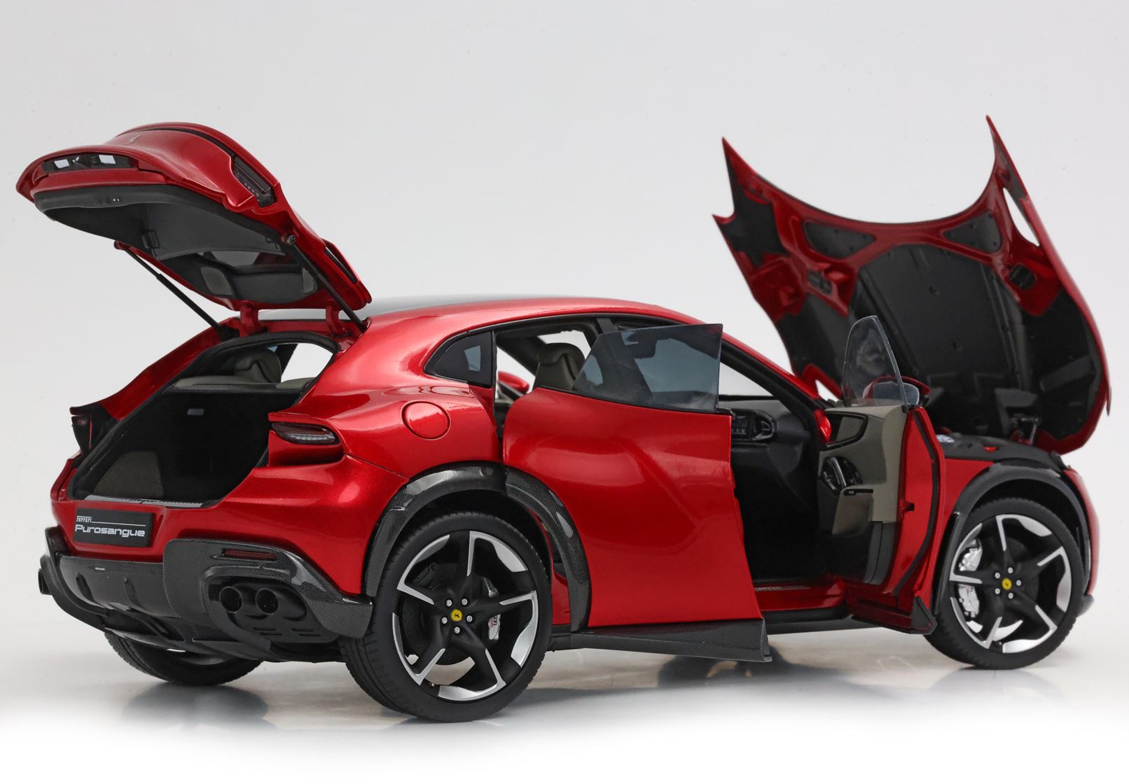 Esclusiva mondiale di Purosangue in scala 1/18 diecast completamente apribile. Rendono unico il modello firmato BBR, una fedele riproduzione dell’aperture di porte e cofani (tramite pistoncini telescopici) ma anche la possibilità di aprire braccioli interni e tappo benzina. Parti in metallo e abs si alternano a fotoincisioni e decals per un risultato di alta qualità. Quattro ruote realmente ammortizzate e sterzanti con due diversi tipi di cerchi: l’interruttore sul fondo permette inoltre di direzionare le ruote posteriori in direzione parallela o opposta. Tutto come nell'auto da strada ma racchiuso in pochi centimetri.