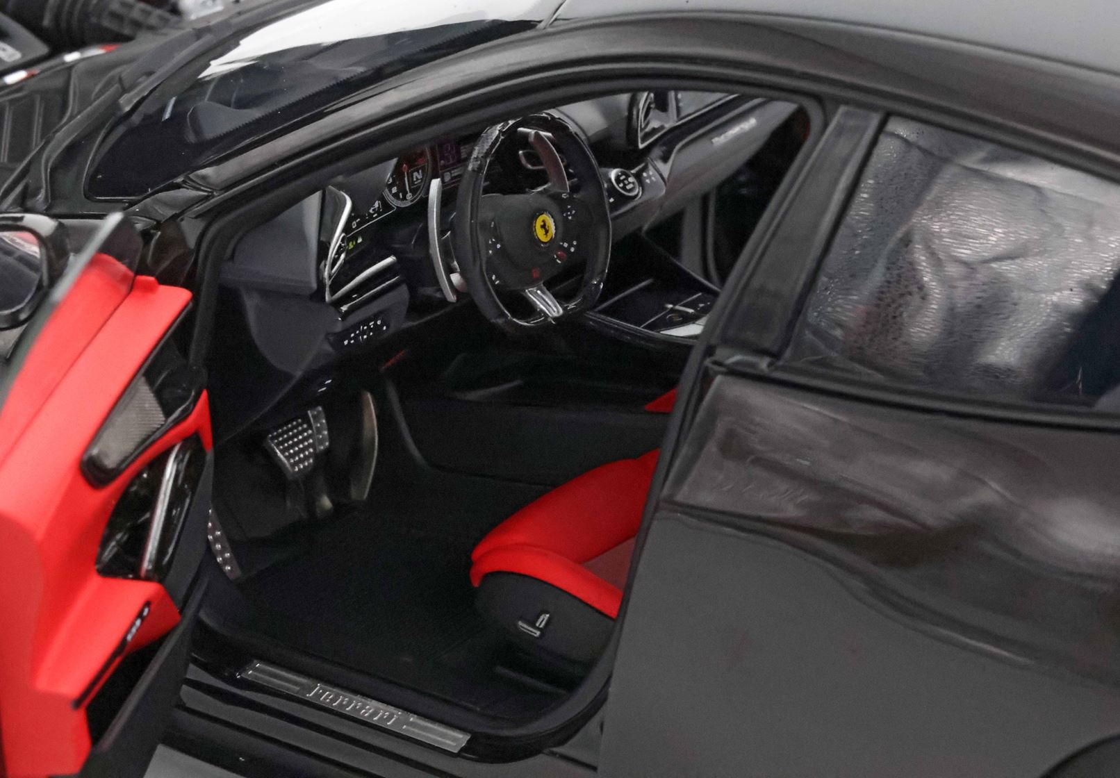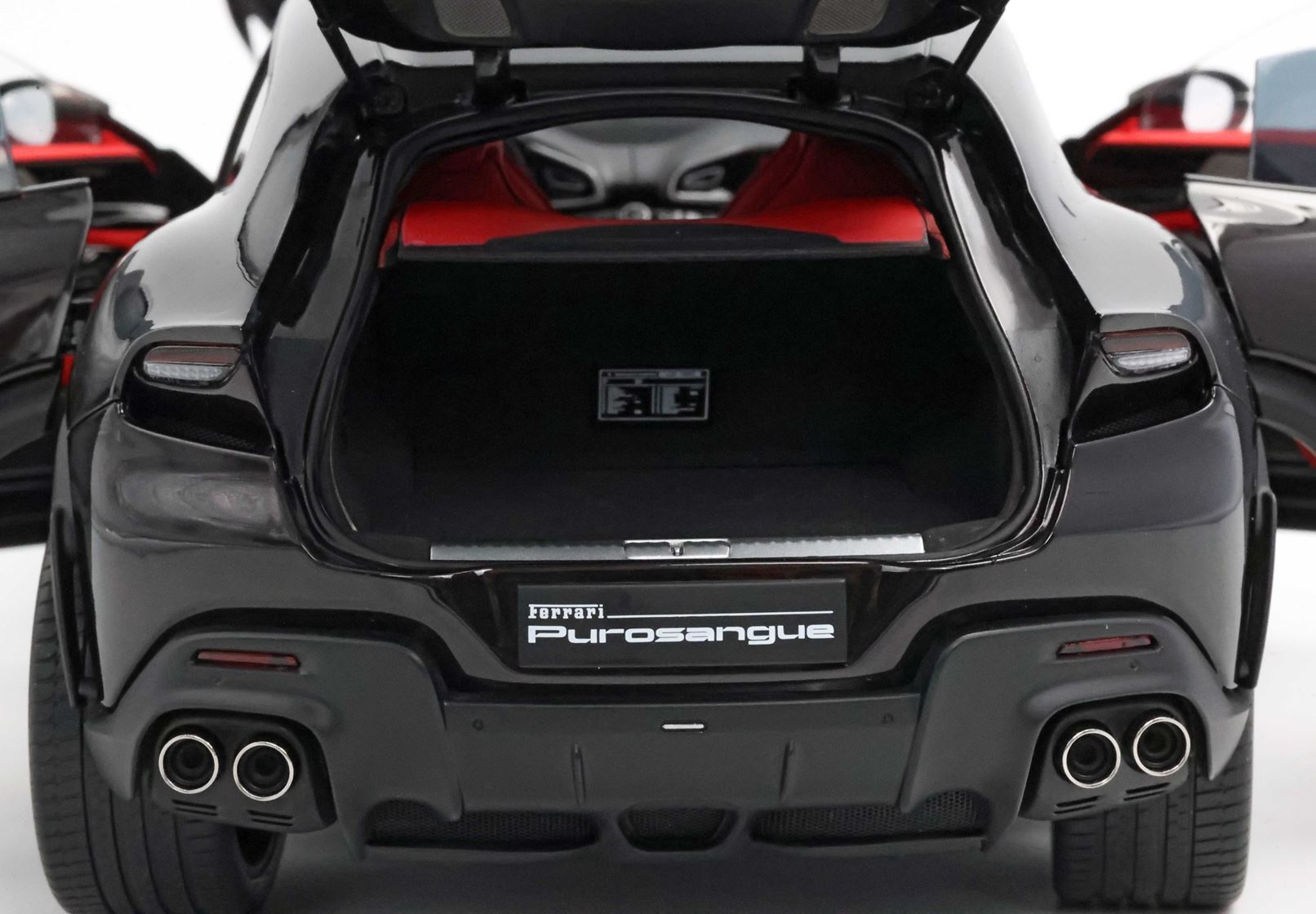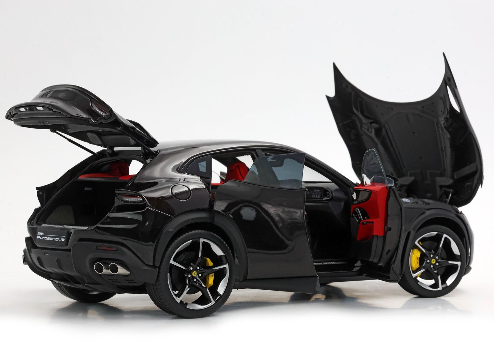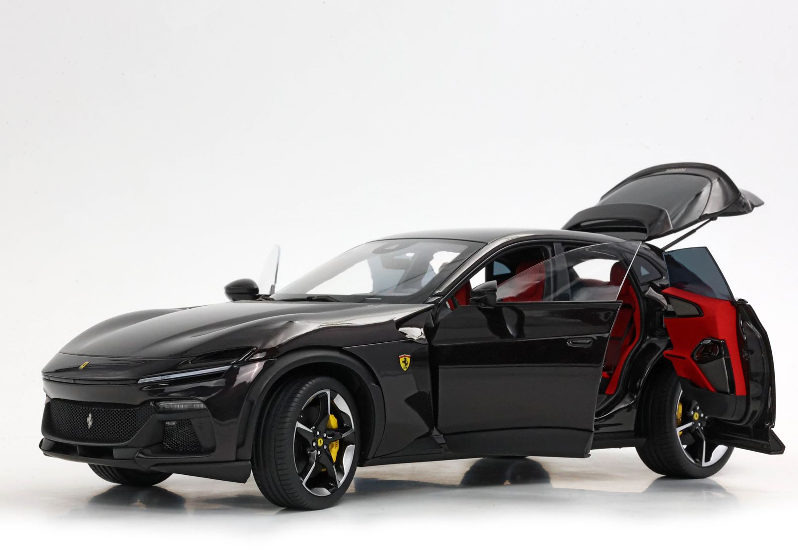 Esclusiva mondiale di Purosangue in scala 1/18 diecast completamente apribile. Rendono unico il modello firmato BBR, una fedele riproduzione dell’aperture di porte e cofani (tramite pistoncini telescopici) ma anche la possibilità di aprire braccioli interni e tappo benzina. Parti in metallo e abs si alternano a fotoincisioni e decals per un risultato di alta qualità. Quattro ruote realmente ammortizzate e sterzanti con due diversi tipi di cerchi: l’interruttore sul fondo permette inoltre di direzionare le ruote posteriori in direzione parallela o opposta. Tutto come nell'auto da strada ma racchiuso in pochi centimetri.