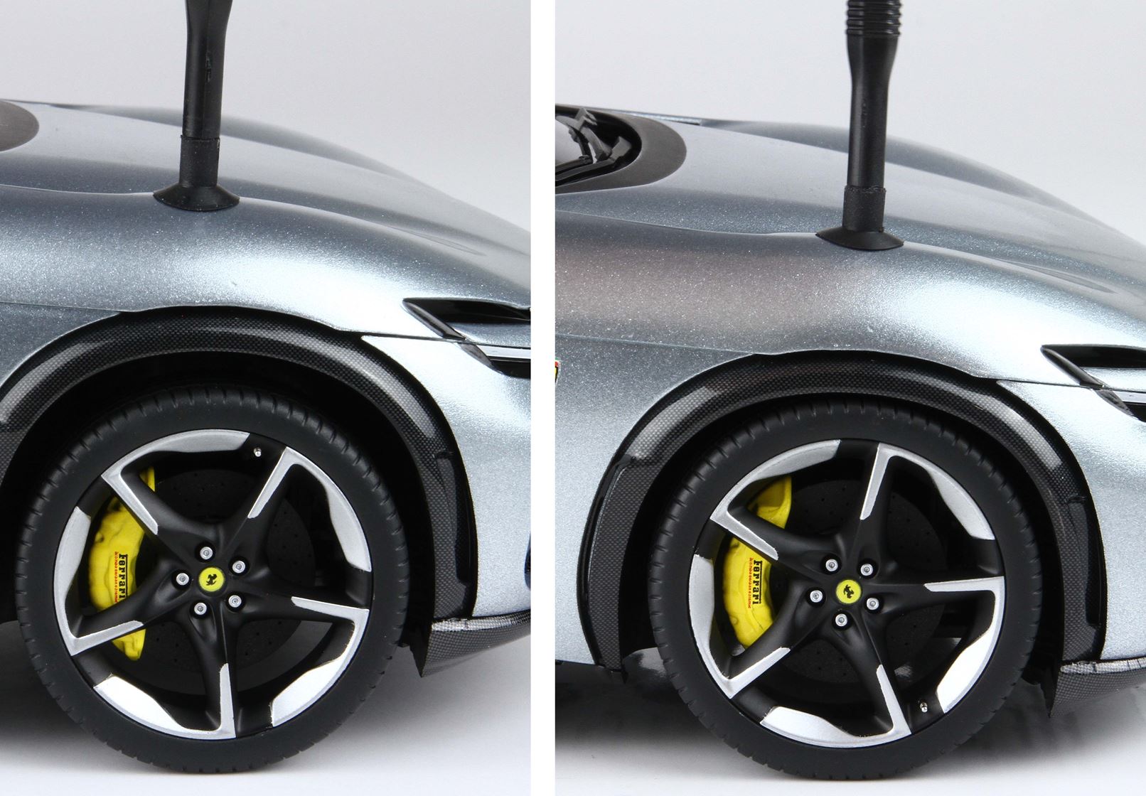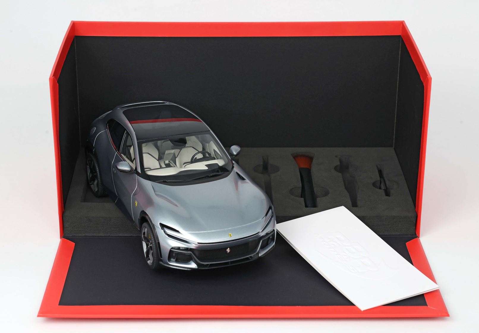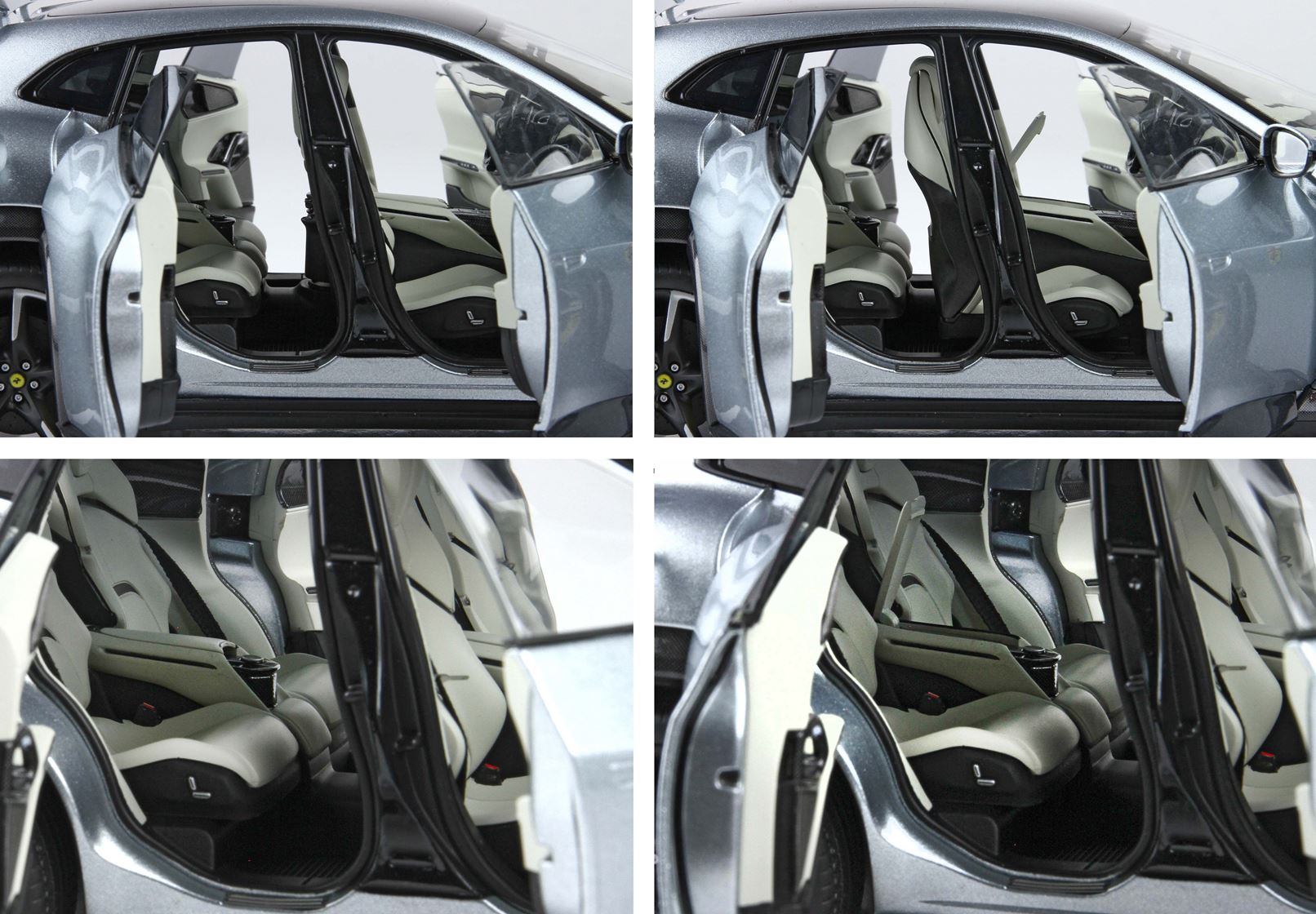 Esclusiva mondiale di Purosangue in scala 1/18 diecast completamente apribile. Rendono unico il modello firmato BBR, una fedele riproduzione dell’aperture di porte e cofani (tramite pistoncini telescopici) ma anche la possibilità di aprire braccioli interni e tappo benzina. Parti in metallo e abs si alternano a fotoincisioni e decals per un risultato di alta qualità. Quattro ruote realmente ammortizzate e sterzanti con due diversi tipi di cerchi: l’interruttore sul fondo permette inoltre di direzionare le ruote posteriori in direzione parallela o opposta. Tutto come nell'auto da strada ma racchiuso in pochi centimetri. Versione con tetto panoramico.