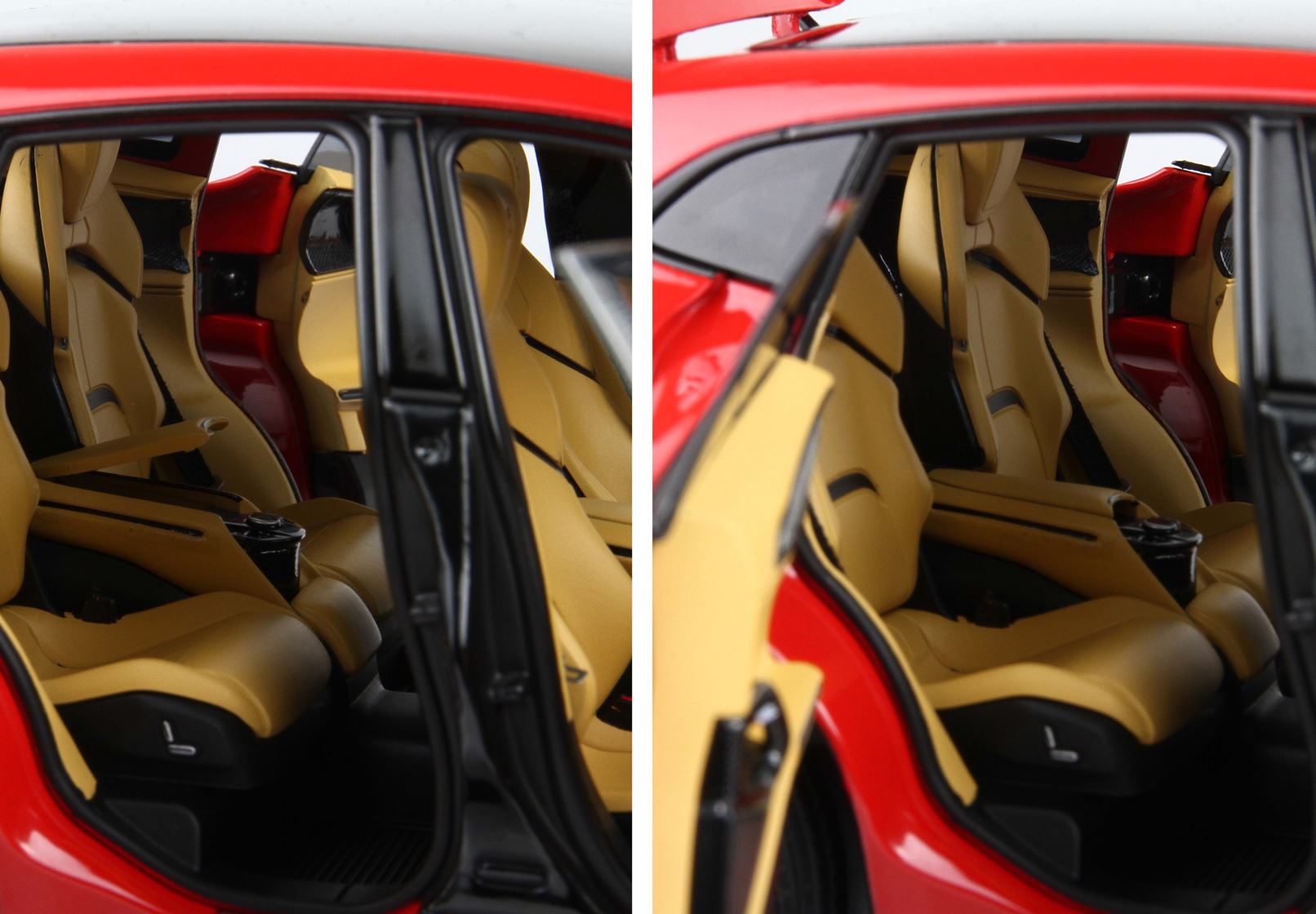 Esclusiva mondiale di Purosangue in scala 1/18 diecast completamente apribile. Rendono unico il modello firmato BBR, una fedele riproduzione dell’aperture di porte e cofani (tramite pistoncini telescopici) ma anche la possibilità di aprire braccioli interni e tappo benzina. Parti in metallo e abs si alternano a fotoincisioni e decals per un risultato di alta qualità. Quattro ruote realmente ammortizzate e sterzanti con due diversi tipi di cerchi: l’interruttore sul fondo permette inoltre di direzionare le ruote posteriori in direzione parallela o opposta. Tutto come nell'auto da strada ma racchiuso in pochi centimetri. Versione con tetto panoramico.
