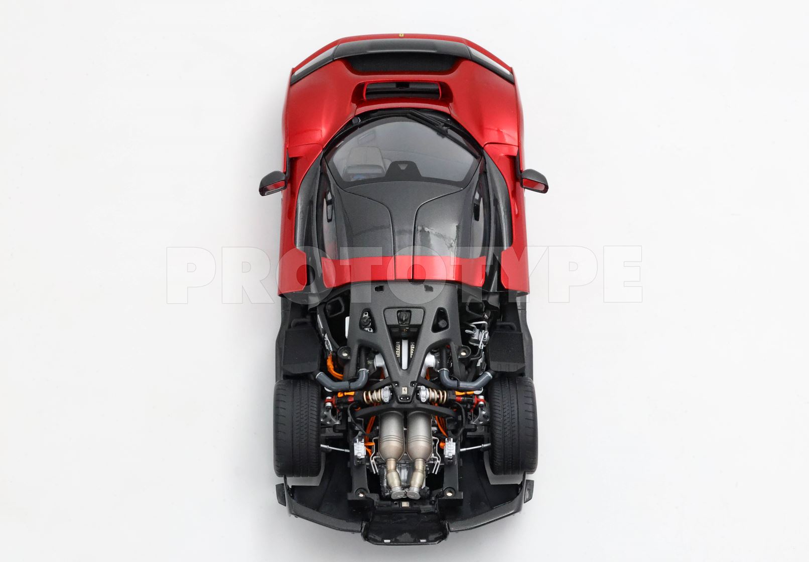 Ferrari F80 in scala 1/18 in metallo diecast completamente apribile. Il modello firmato BBR riproduce l’apertura di porte e cofano posteriore come nell'auto reale. L'alettone posteriore è mobile. Quattro ruote realmente sterzanti.