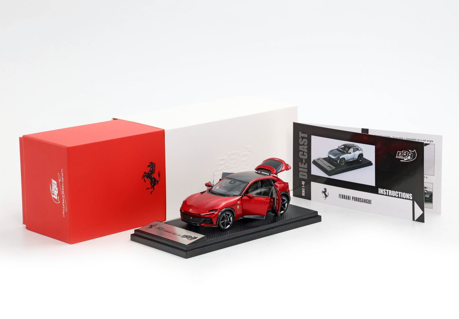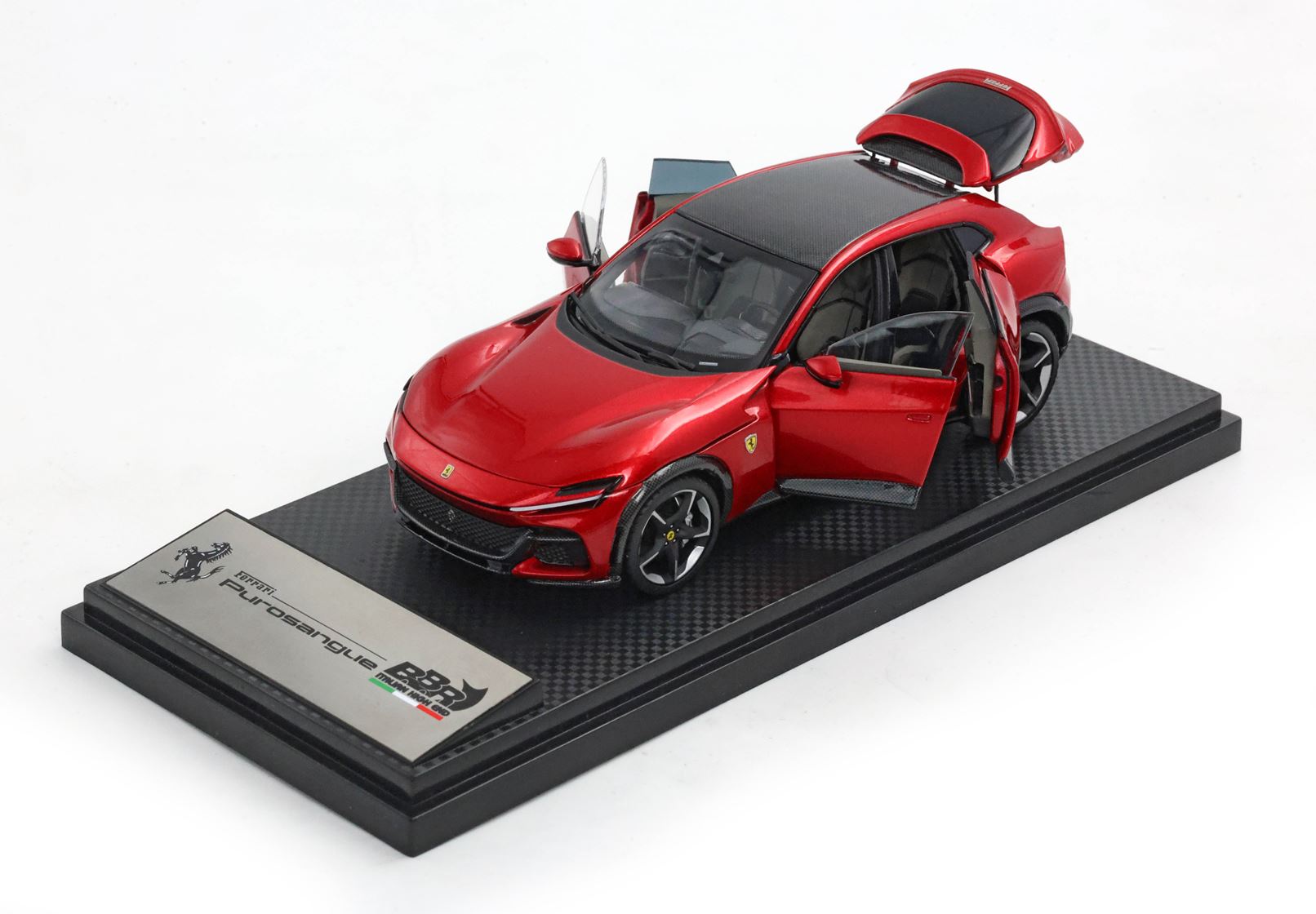 Esclusiva mondiale di Purosangue die-cast completamente apribile in scala 1/43. Rende unico il modello firmato BBR, la riproduzione fedele dell’apertura delle porte comprese quelle controvento posteriori che caratterizzano la prima quattro porte nella storia di Ferrari. Anche l’apertura del cofano anteriore consente di ammirare la miniatura del motore prodotto in ogni dettaglio. Aprendo il baule invece, si può vedere da vicino il lusso degli interni. Ben 105 parti in metallo e abs si alternano a fotoincisioni e decals per un risultato di alta qualità.