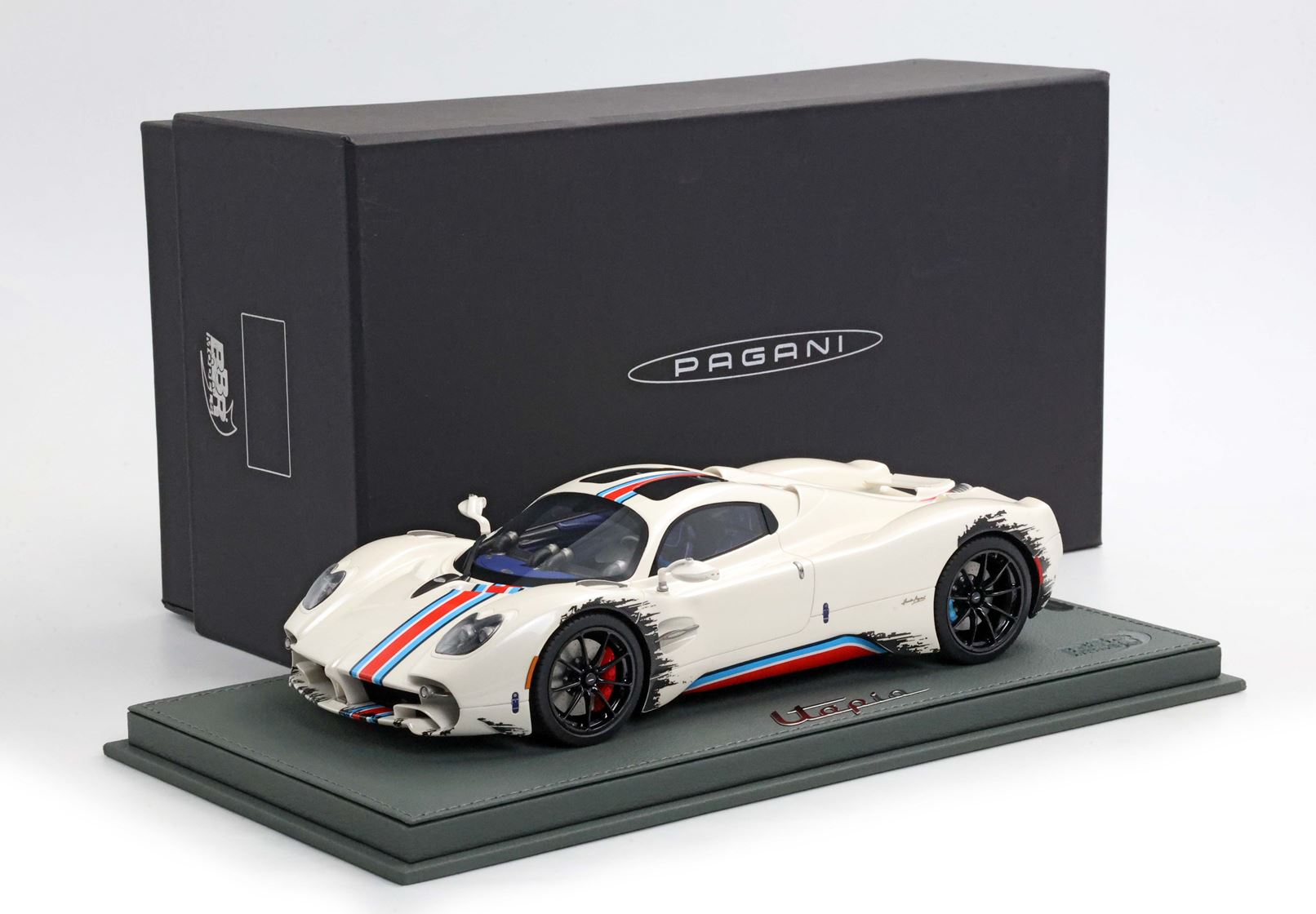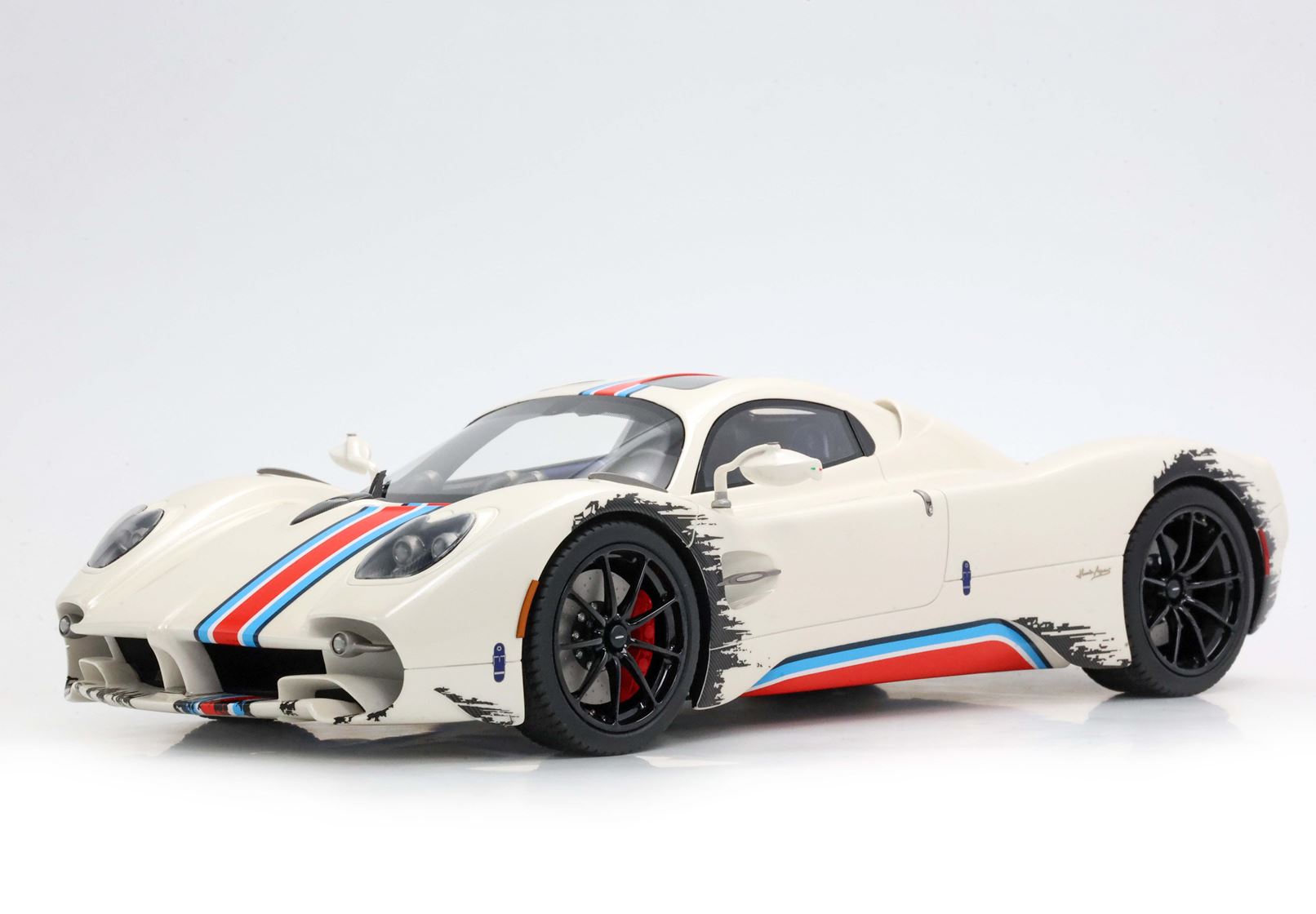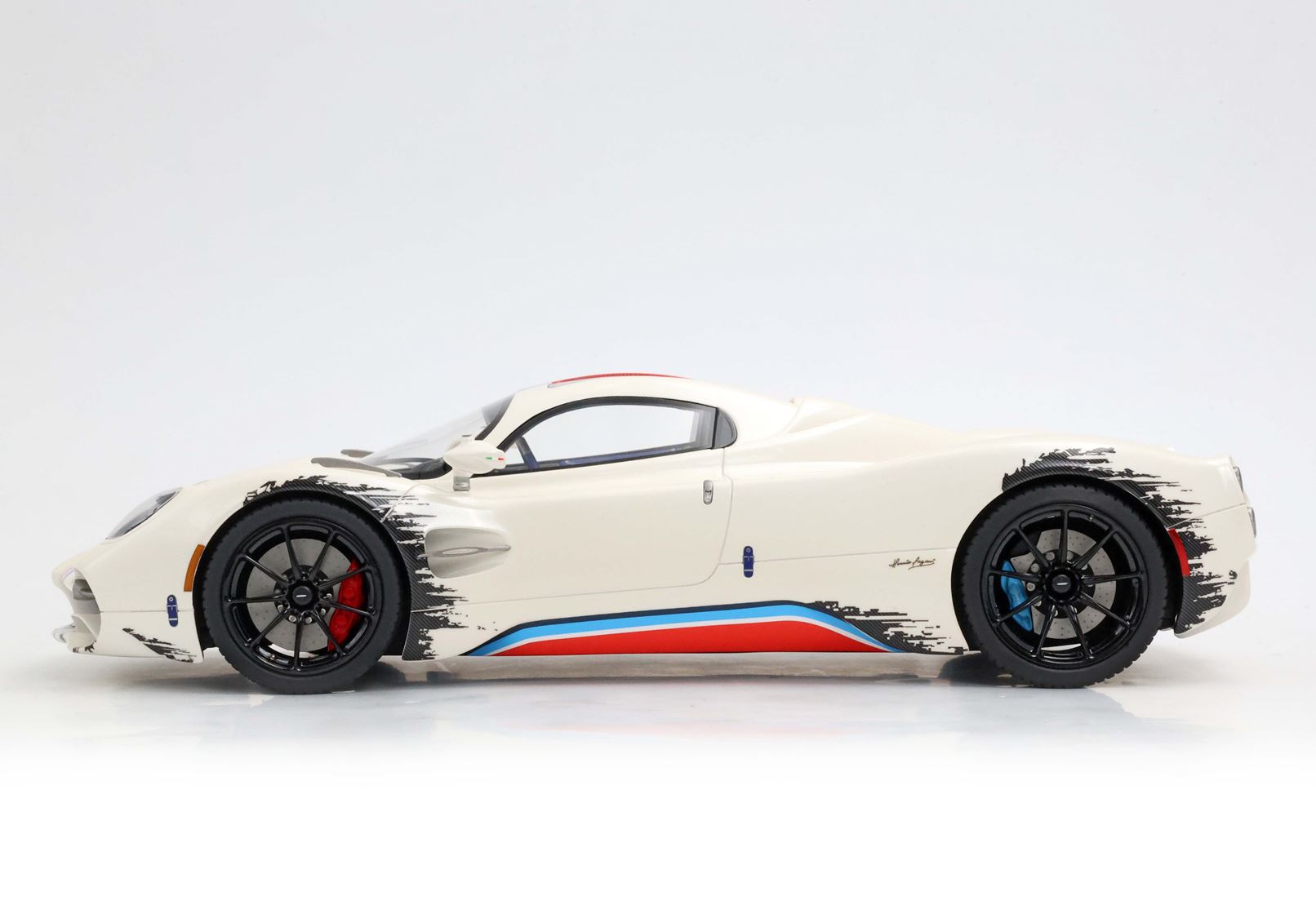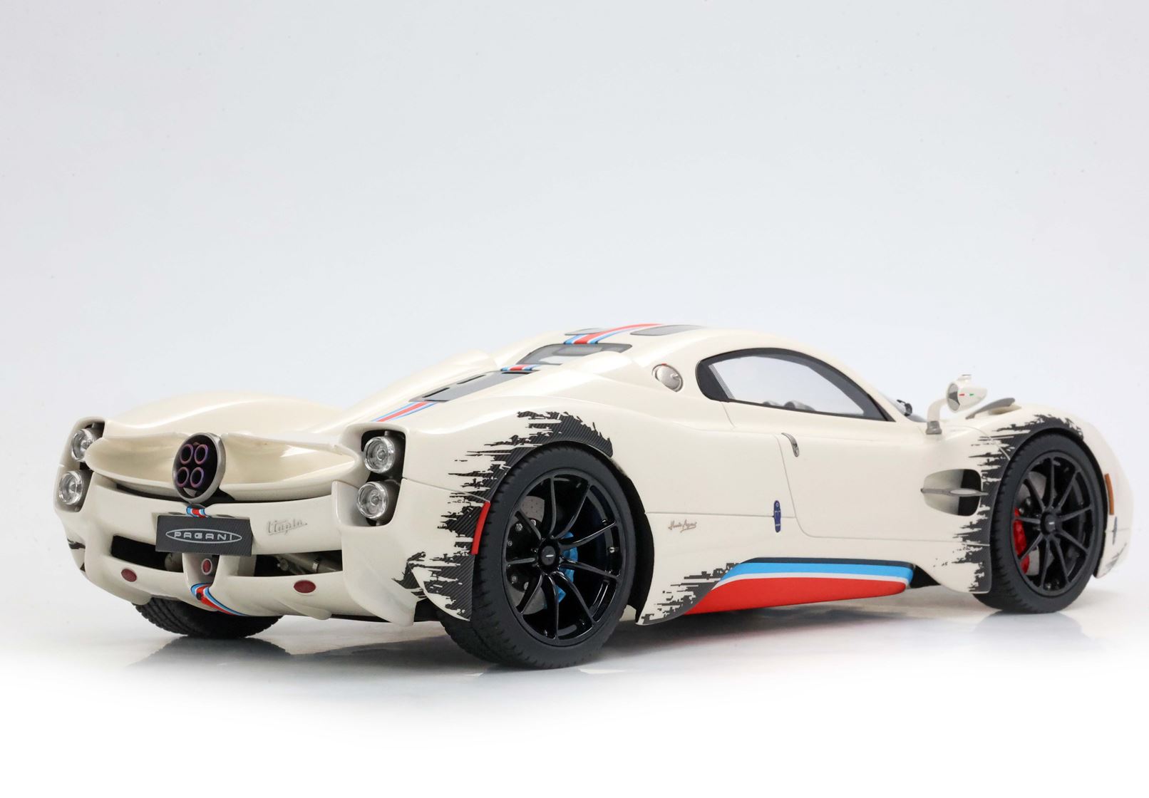 Una striscia ispirata alle corse nei colori Rosso Monza, Blu e Turchese su Bianco Benny è l'elemento distintivo di questa Pagani Utopia unica. "Il coyote" è una creazione non convenzionale con scelte cromatiche asimmetriche, ma BBR le ha replicate fin nei minimi dettagli. La striscia è posizionata in modo asimmetrico sul lato sinistro del cofano anteriore. Anche i freni sono diversi: quelli anteriori sono rossi e quelli posteriori blu. Intorno ai cerchi, con inserti in carbonio, viene simulato lo sporco di fine gara. BBR ha realizzato lo stesso effetto con una complessa decal. Riuscite a immaginare quanti componenti e quanta maestria artigianale siano necessari per realizzare questo modello BBR?