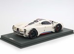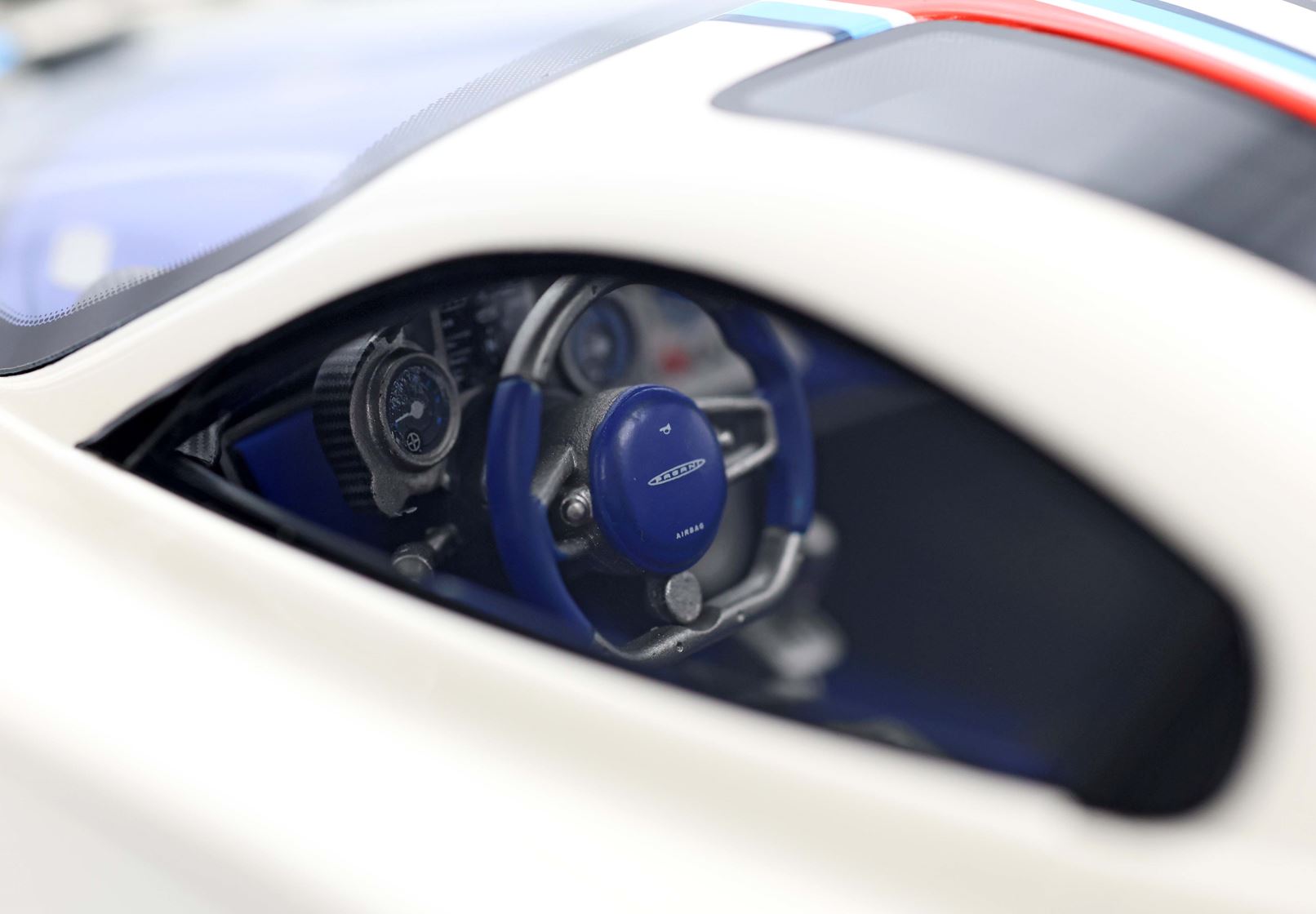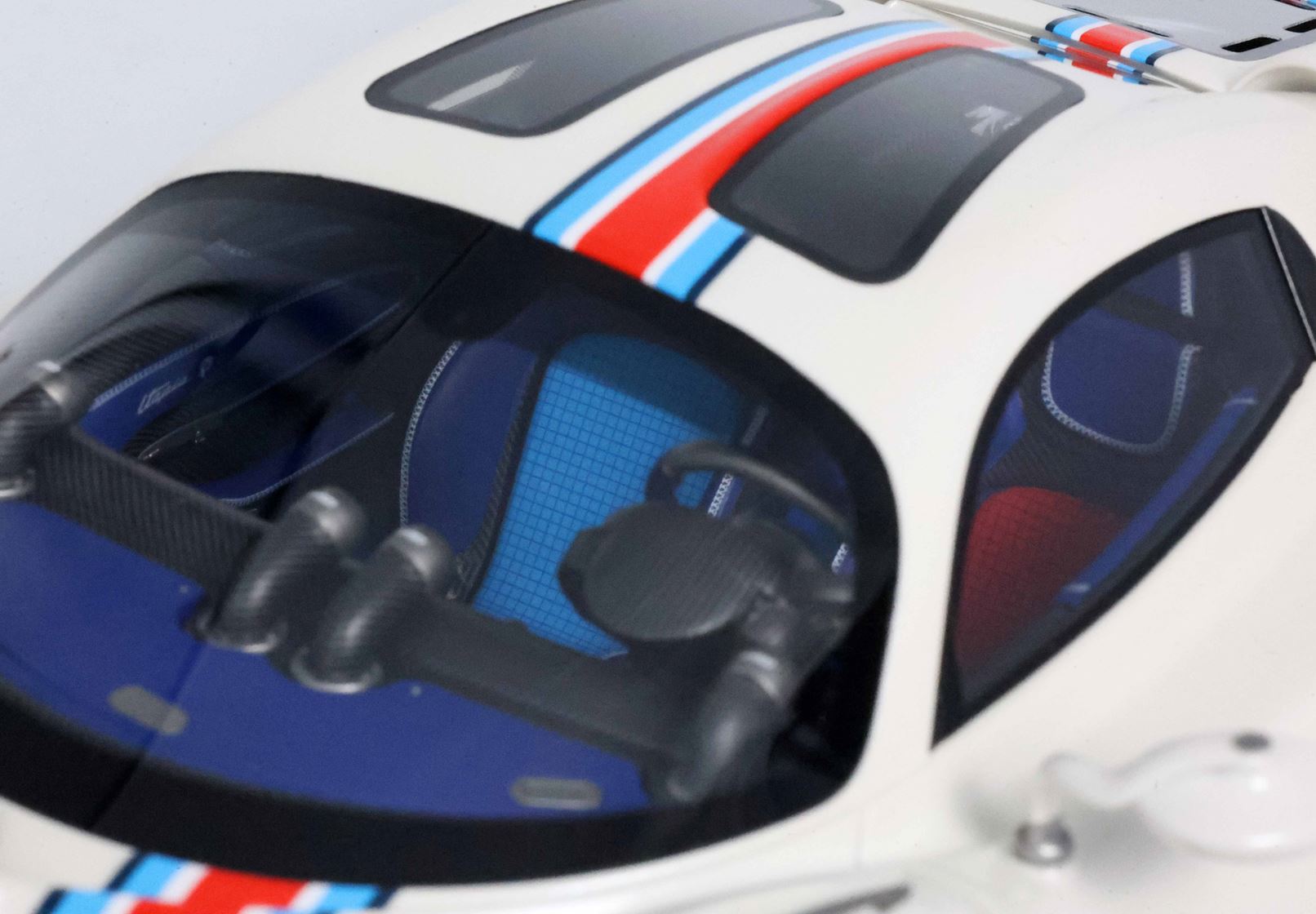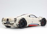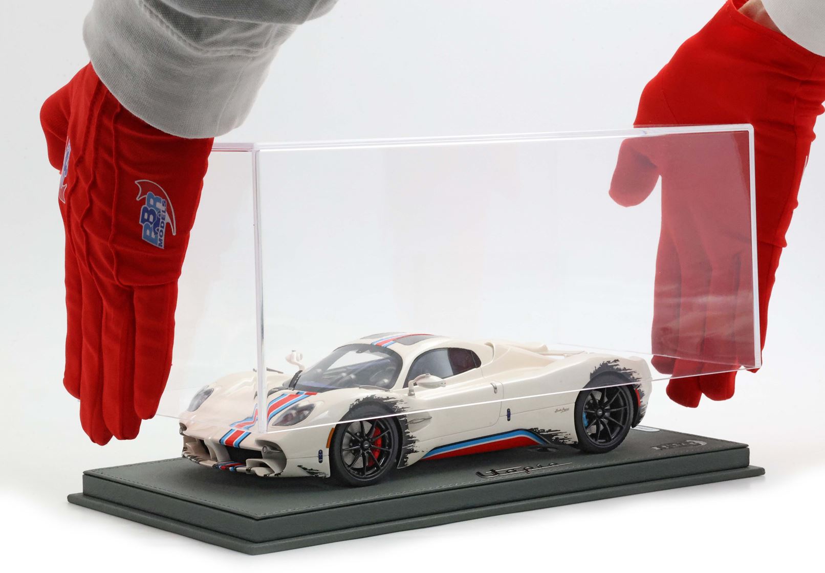 Una striscia ispirata alle corse nei colori Rosso Monza, Blu e Turchese su Bianco Benny è l'elemento distintivo di questa Pagani Utopia unica. "Il coyote" è una creazione non convenzionale con scelte cromatiche asimmetriche, ma BBR le ha replicate fin nei minimi dettagli. La striscia è posizionata in modo asimmetrico sul lato sinistro del cofano anteriore. Anche i freni sono diversi: quelli anteriori sono rossi e quelli posteriori blu. Intorno ai cerchi, con inserti in carbonio, viene simulato lo sporco di fine gara. BBR ha realizzato lo stesso effetto con una complessa decal. Riuscite a immaginare quanti componenti e quanta maestria artigianale siano necessari per realizzare questo modello BBR?