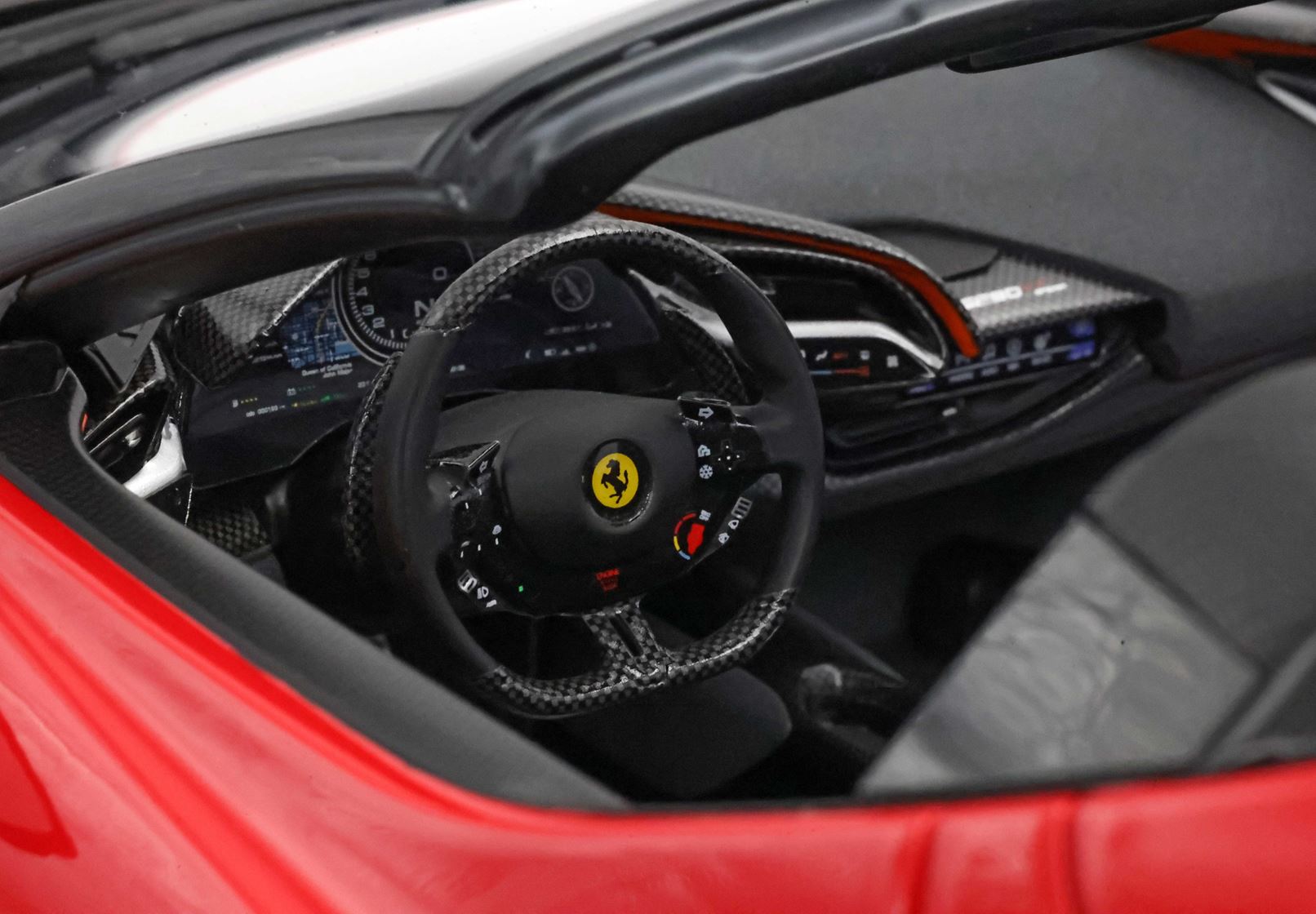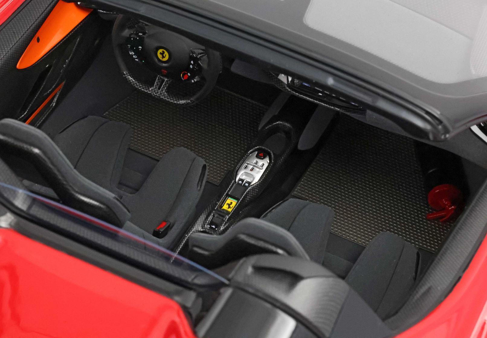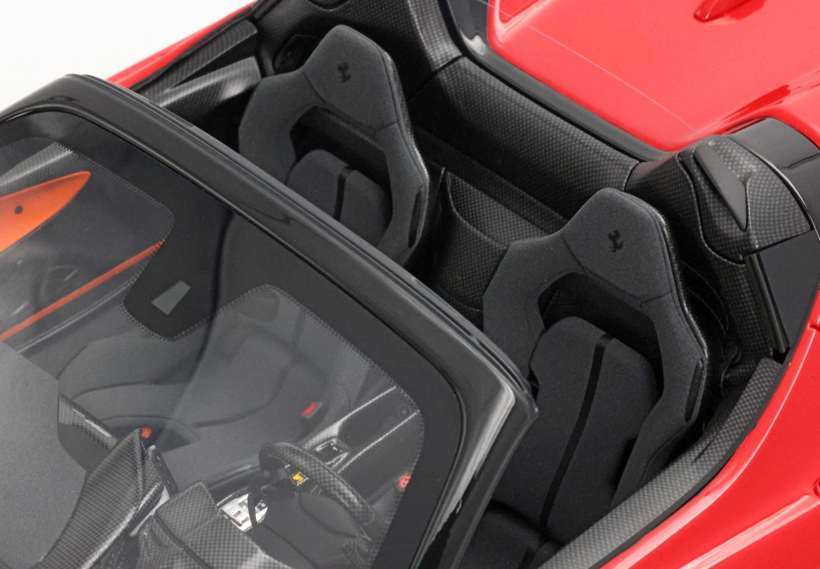 L'abitacolo, ispirato al mondo delle corse, è un connubio di lusso e funzionalità. Materiali pregiati come la fibra di carbonio e i tessuti tecnici creano un ambiente raffinato e leggero, dove ogni dettaglio è pensato per esaltare il piacere di guida.