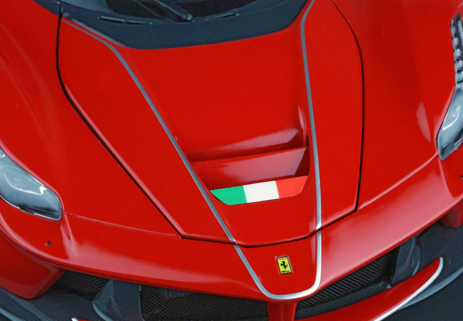 MODELLO CON BANDIERA ITALIANA SUL COFANO ANTERIORE. VETRINA CON DISEGNO TECNICO DELL'AUTO E BASE IN ECOPELLE INCLUSE