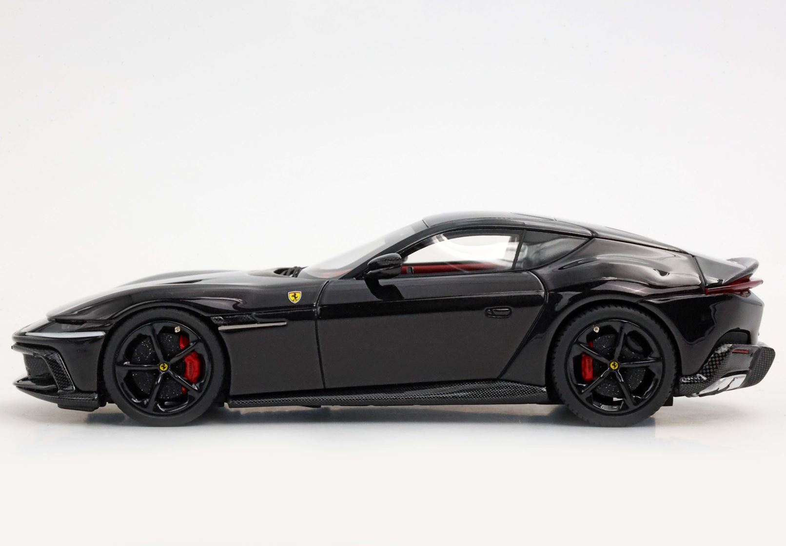 Le linee essenziali sono rese muscolari dai parafanghi. Quello posteriore prominente ma senza eccessi, è perfettamente integrato nella geometria dell'auto. Quello anteriore, con evidente richiamo alla 365GTB Daytona, mostra il suo fascino sinuoso impreziosendo la fiancata. Nel frontale, un'unica fascia avvolgente integra i fari e i DRL come due lame di luce. Proporzioni perfette per una GT: muso lunghissimo, abitacolo compatto e retro corto.