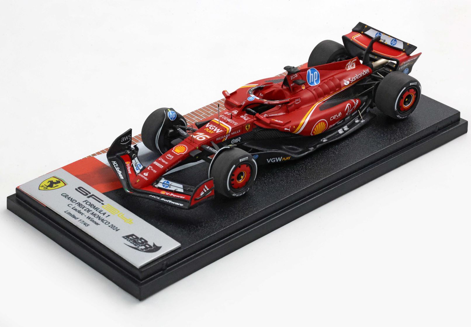 In esclusiva BBR propone un automodello in scala 1/43, replica della SF24 di Leclerc su una delle più note curve del circuito di Montecarlo. Ben evidente sulla base il cordolo e i mattoncini che contornano il circuito stradale monegasco.