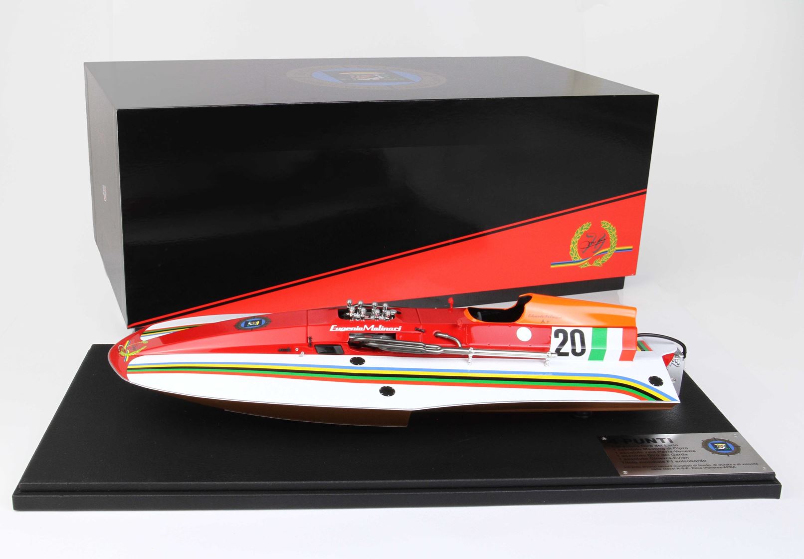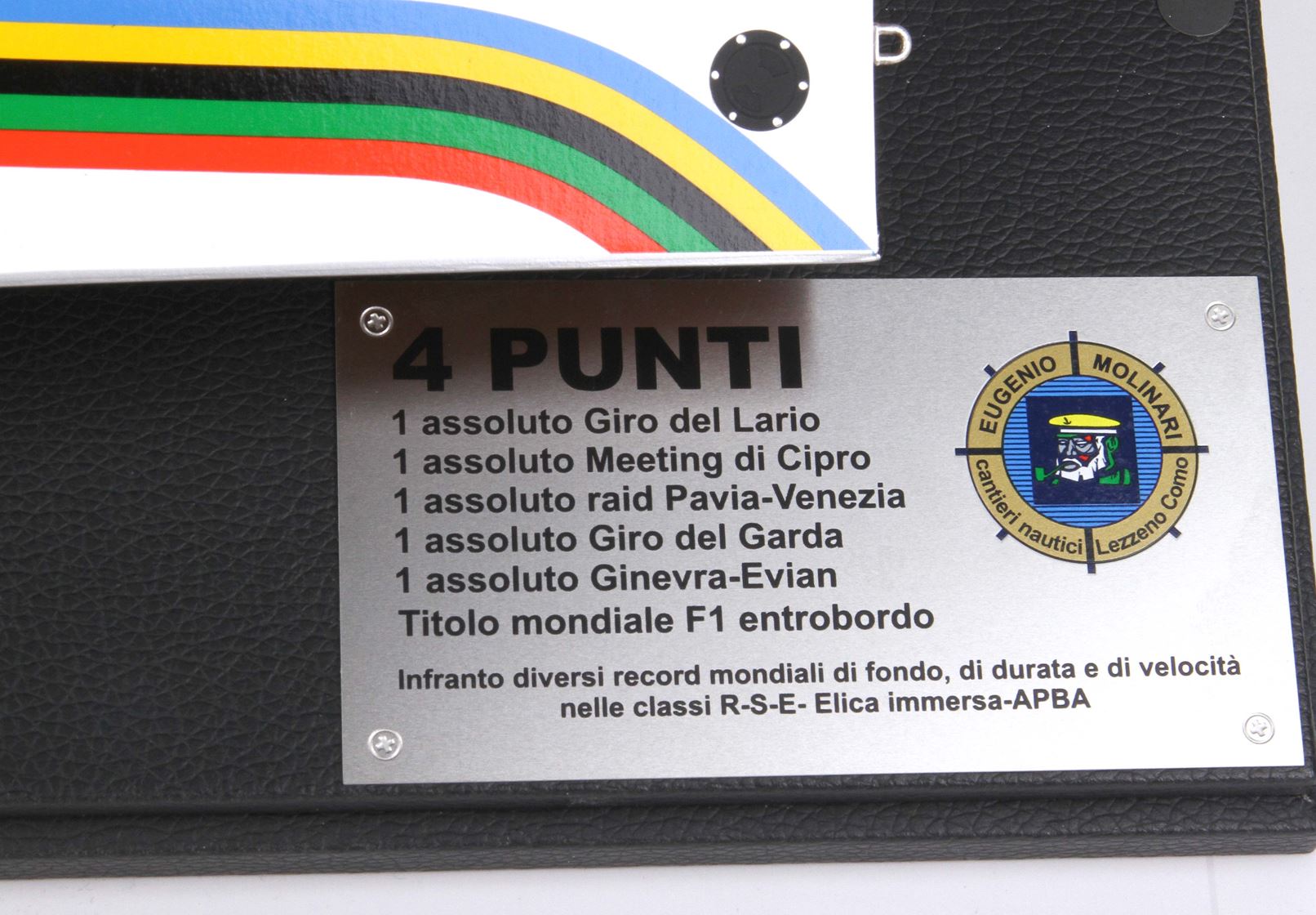 Base in ecopelle, targhetta in alluminio con record, vetrina in plexiglass fatta mano, scatola dedicata con logo ufficiale Cantieri Molinari