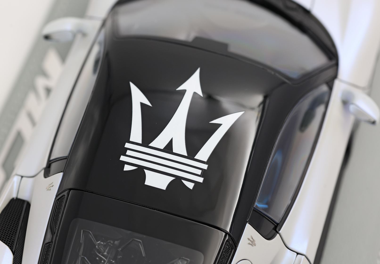 MODELLO CON LOGO TRIDENTE MASERATI SUL TETTO NERO e vetrina inclusa