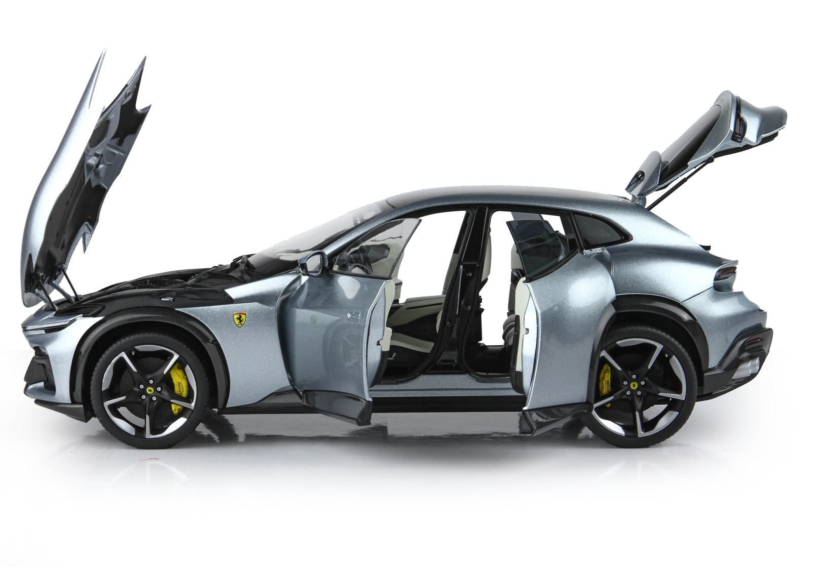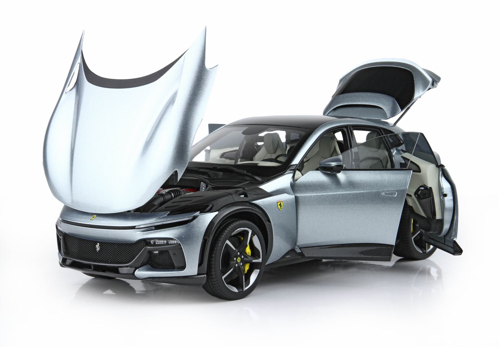 Esclusiva mondiale di Purosangue in scala 1/18 diecast completamente apribile. Rendono unico il modello firmato BBR, una fedele riproduzione dell’aperture di porte e cofani (tramite pistoncini telescopici) ma anche la possibilità di aprire braccioli interni e tappo benzina. Parti in metallo e abs si alternano a fotoincisioni e decals per un risultato di alta qualità. Quattro ruote realmente ammortizzate e sterzanti con due diversi tipi di cerchi: l’interruttore sul fondo permette inoltre di direzionare le ruote posteriori in direzione parallela o opposta. Tutto come nell'auto da strada ma racchiuso in pochi centimetri. Versione con tetto panoramico.