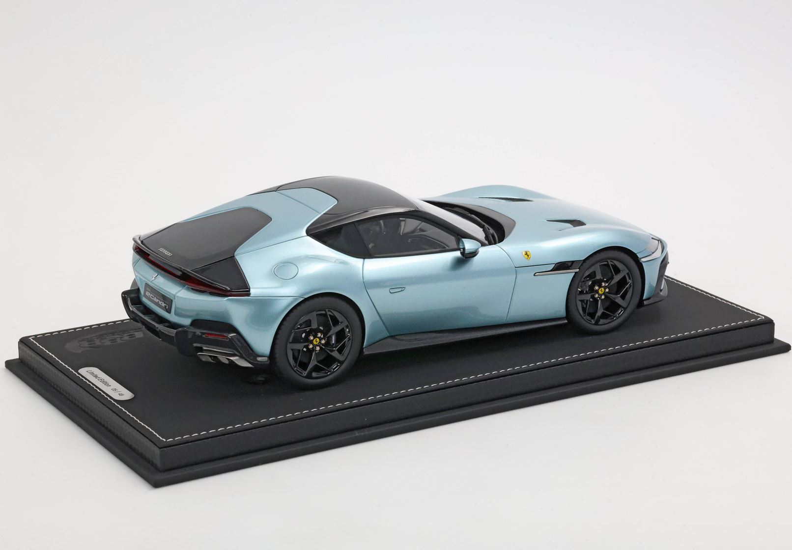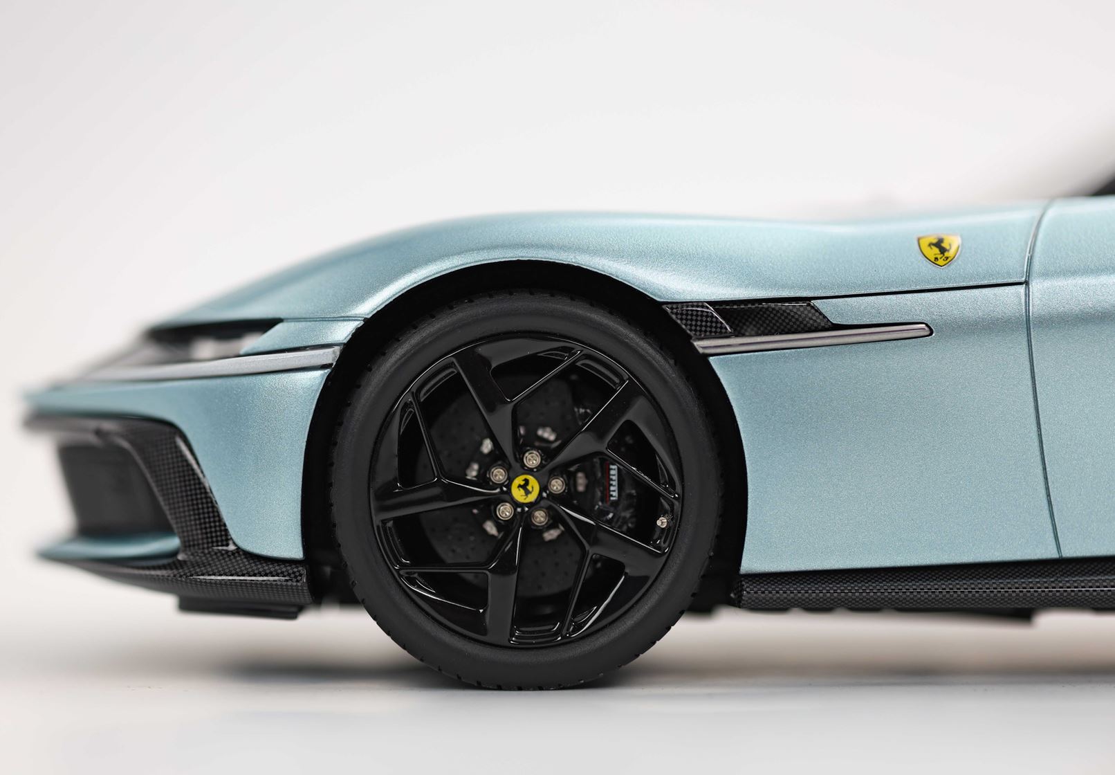 Le linee essenziali sono rese muscolari dai parafanghi. Quello posteriore prominente ma senza eccessi, è perfettamente integrato nella geometria dell'auto. Quello anteriore, con evidente richiamo alla 365GTB Daytona, mostra il suo fascino sinuoso impreziosendo la fiancata. Nel frontale, un'unica fascia avvolgente integra i fari e i DRL come due lame di luce. Proporzioni perfette per una GT: muso lunghissimo, abitacolo compatto e retro corto.