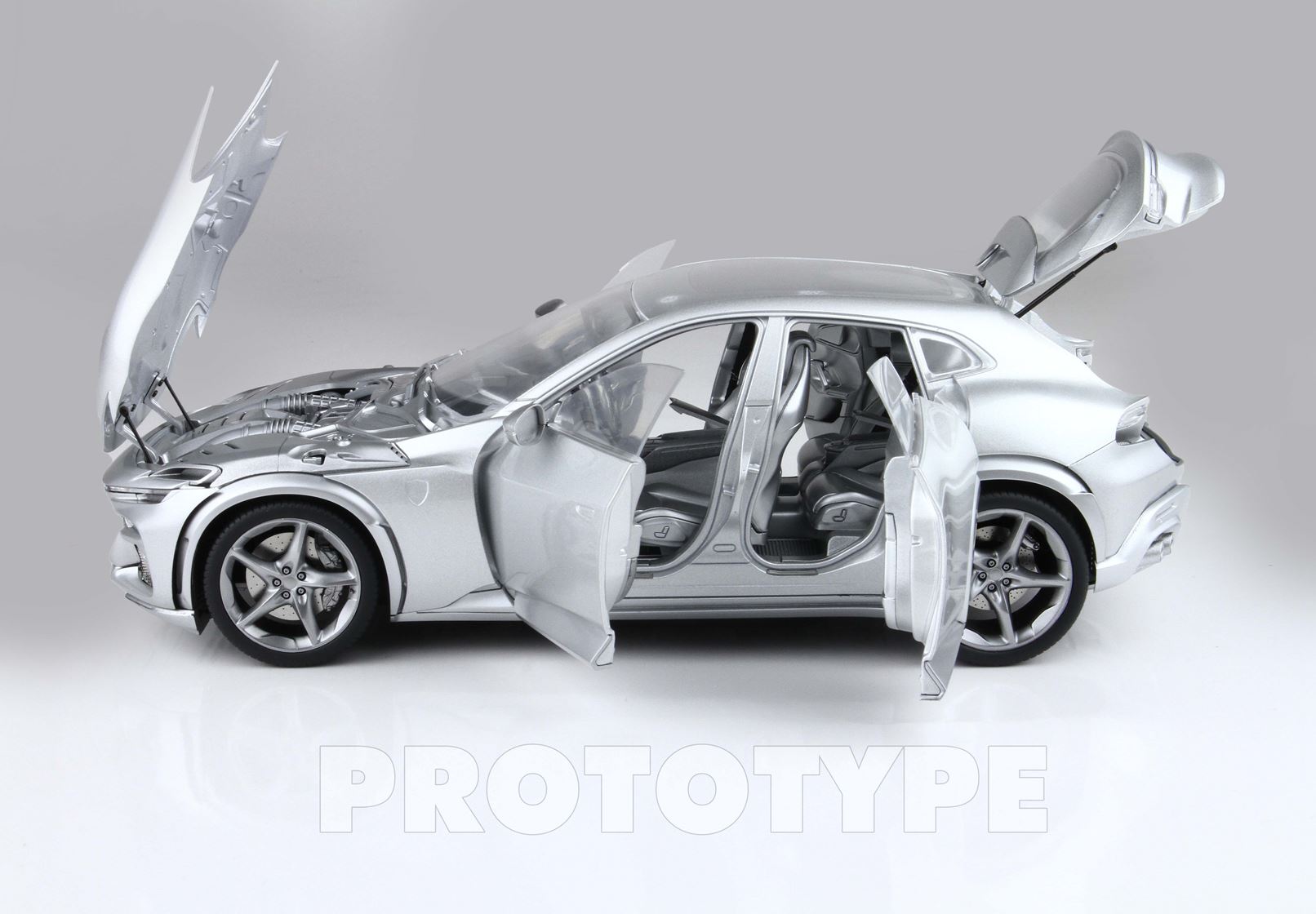 Esclusiva mondiale di Purosangue in scala 1/18 diecast completamente apribile. Rendono unico il modello firmato BBR, una fedele riproduzione dell’aperture di porte e cofani (tramite pistoncini telescopici) ma anche la possibilità di aprire braccioli interni e tappo benzina. Parti in metallo e abs si alternano a fotoincisioni e decals per un risultato di alta qualità. Quattro ruote realmente ammortizzate e sterzanti con due diversi tipi di cerchi: l’interruttore sul fondo permette inoltre di direzionare le ruote posteriori in direzione parallela o opposta. Tutto come nell'auto da strada ma racchiuso in pochi centimetri.