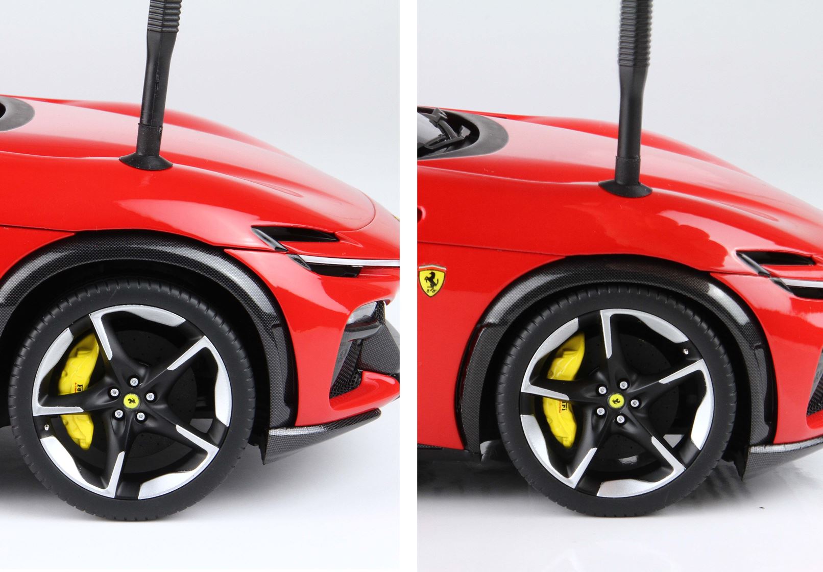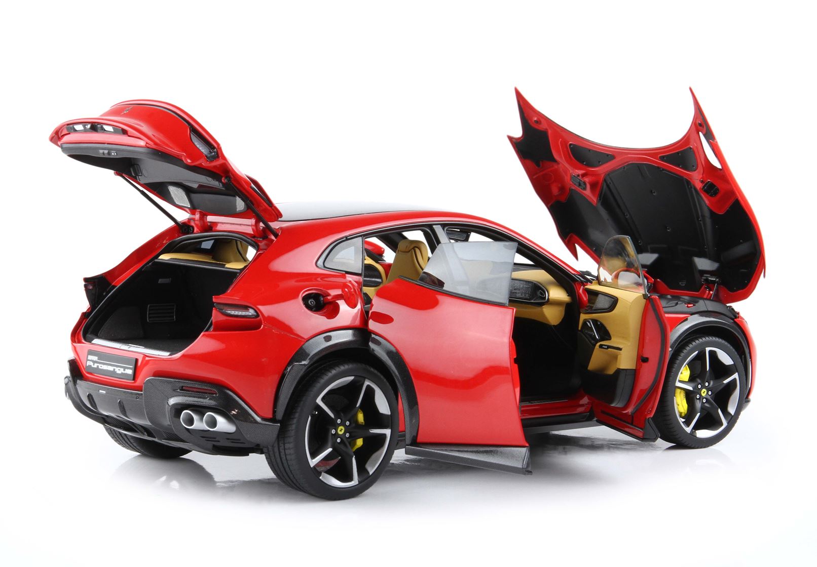 Esclusiva mondiale di Purosangue in scala 1/18 diecast completamente apribile. Rendono unico il modello firmato BBR, una fedele riproduzione dell’aperture di porte e cofani (tramite pistoncini telescopici) ma anche la possibilità di aprire braccioli interni e tappo benzina. Parti in metallo e abs si alternano a fotoincisioni e decals per un risultato di alta qualità. Quattro ruote realmente ammortizzate e sterzanti con due diversi tipi di cerchi: l’interruttore sul fondo permette inoltre di direzionare le ruote posteriori in direzione parallela o opposta. Tutto come nell'auto da strada ma racchiuso in pochi centimetri. Versione con tetto panoramico.