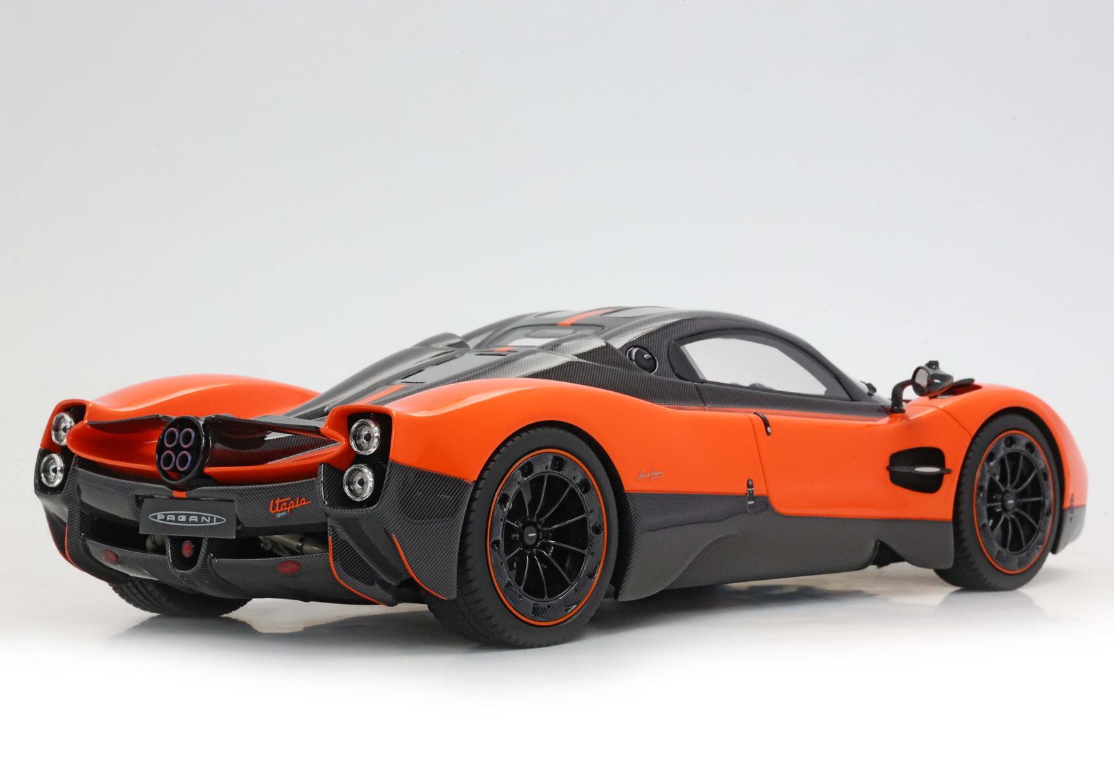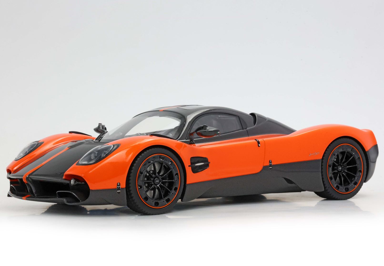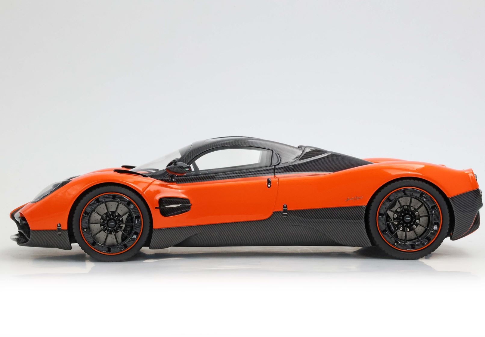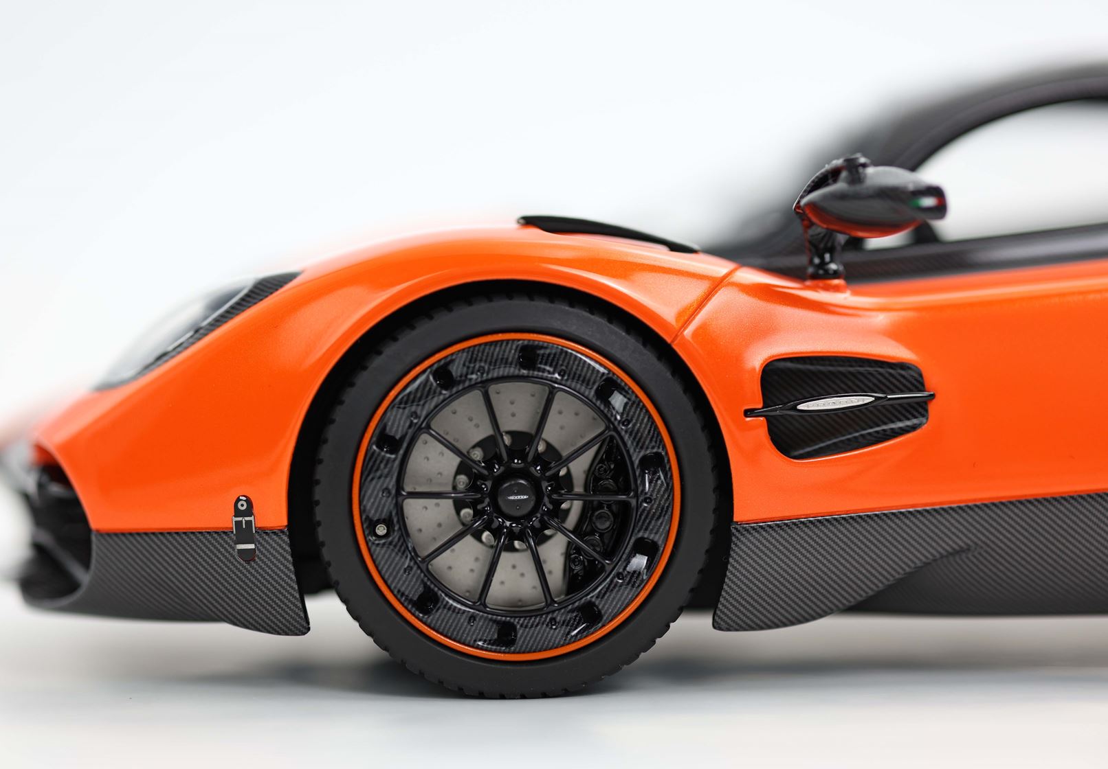 Il modello è stato verniciato con uno dei colori più amati da Pagani per le sue creazioni. L'arancio Marbella richiama i tramonti della Costa del Sol in Spagna e su questa utopia è alternato alle parti che replicano la fibra di carbonio con disposizione della trama a V.