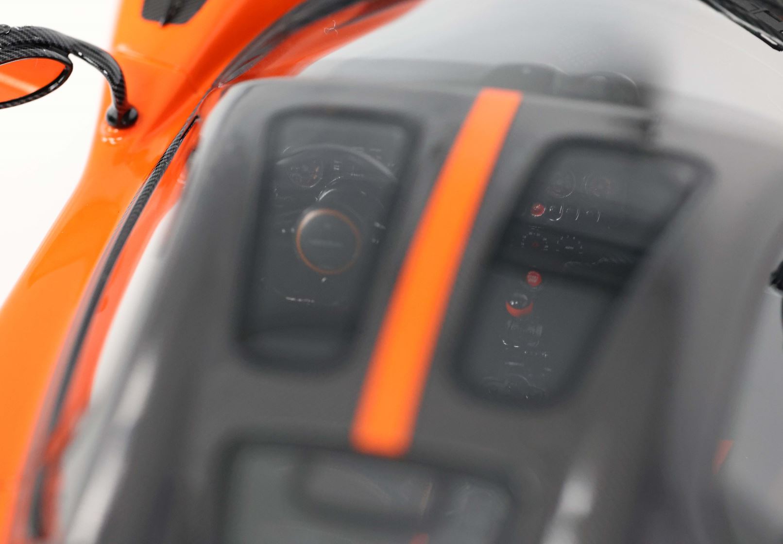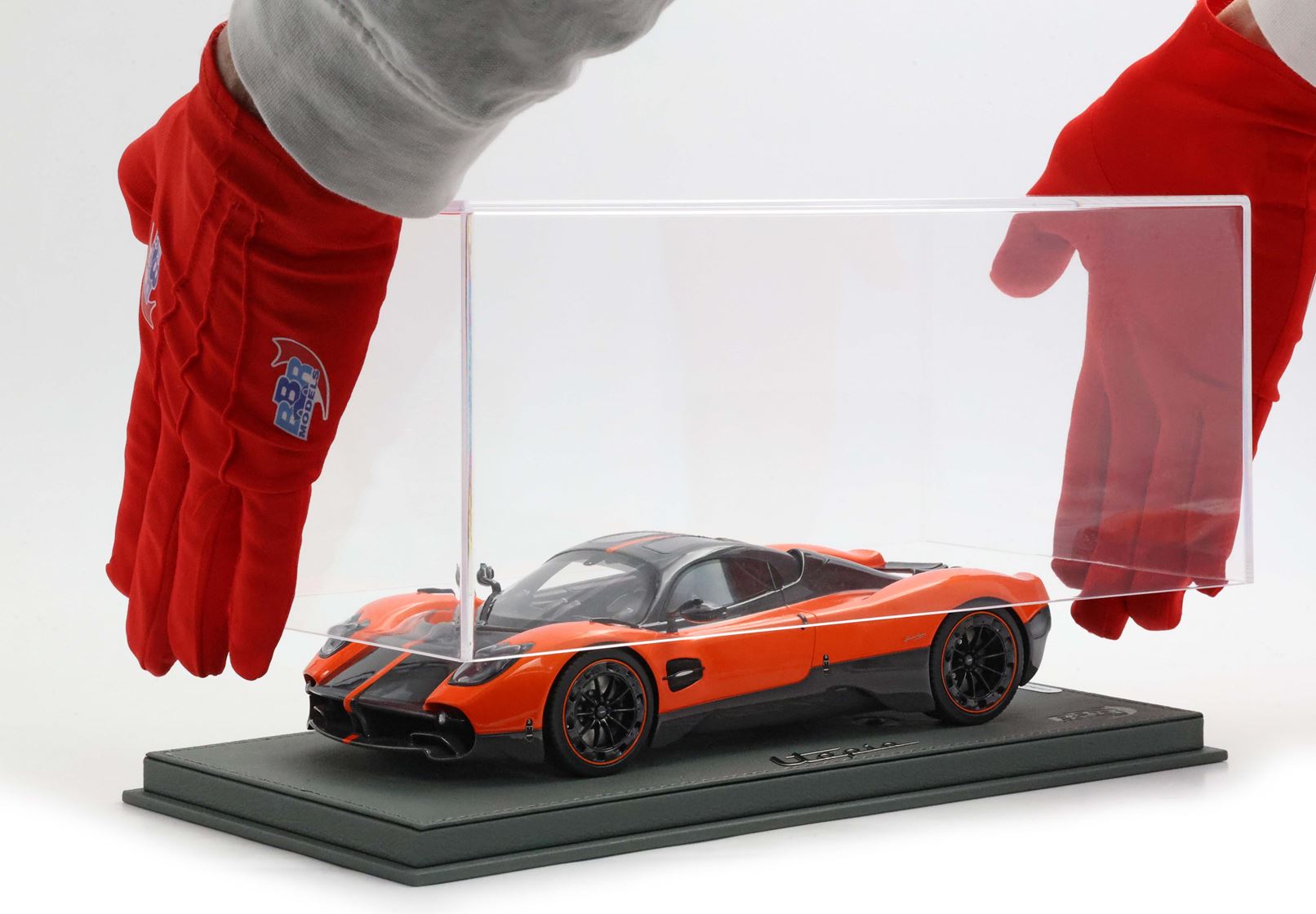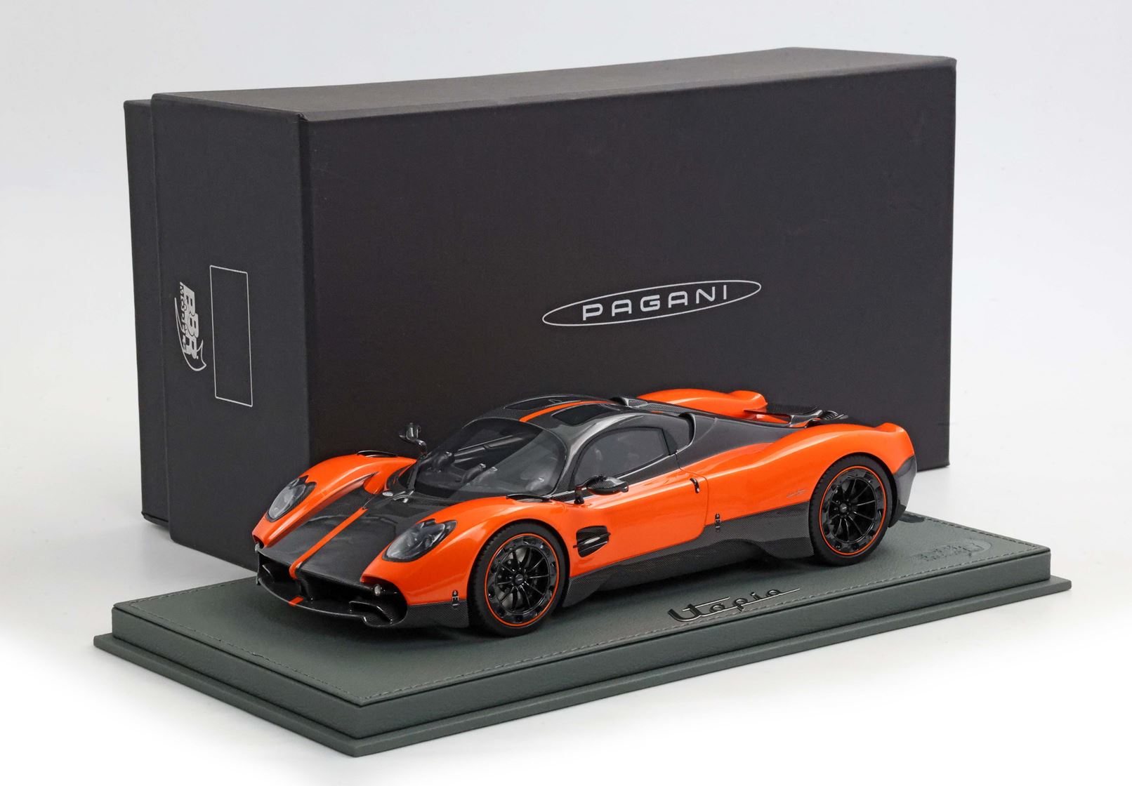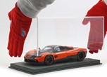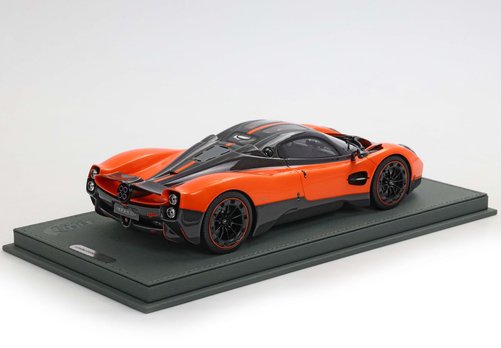 Il modello è stato verniciato con uno dei colori più amati da Pagani per le sue creazioni. L'arancio Marbella richiama i tramonti della Costa del Sol in Spagna e su questa utopia è alternato alle parti che replicano la fibra di carbonio con disposizione della trama a V.